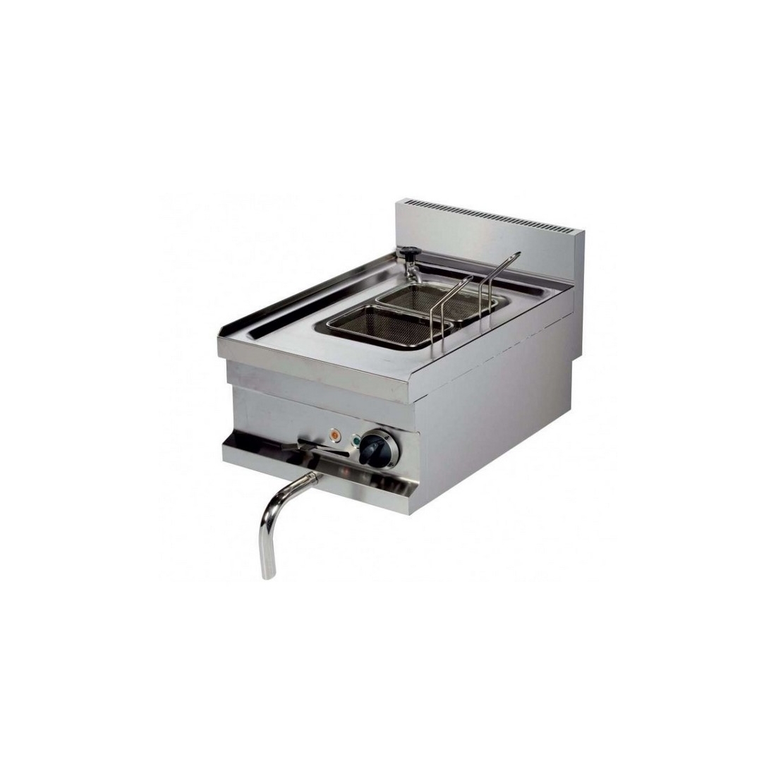 Cocedor de pastas profesional, eléctrico con capacidad de dos cestas y 14 litros. Cuenta con Válvula de drenaje y llenado. Incluye grifo de drenaje.