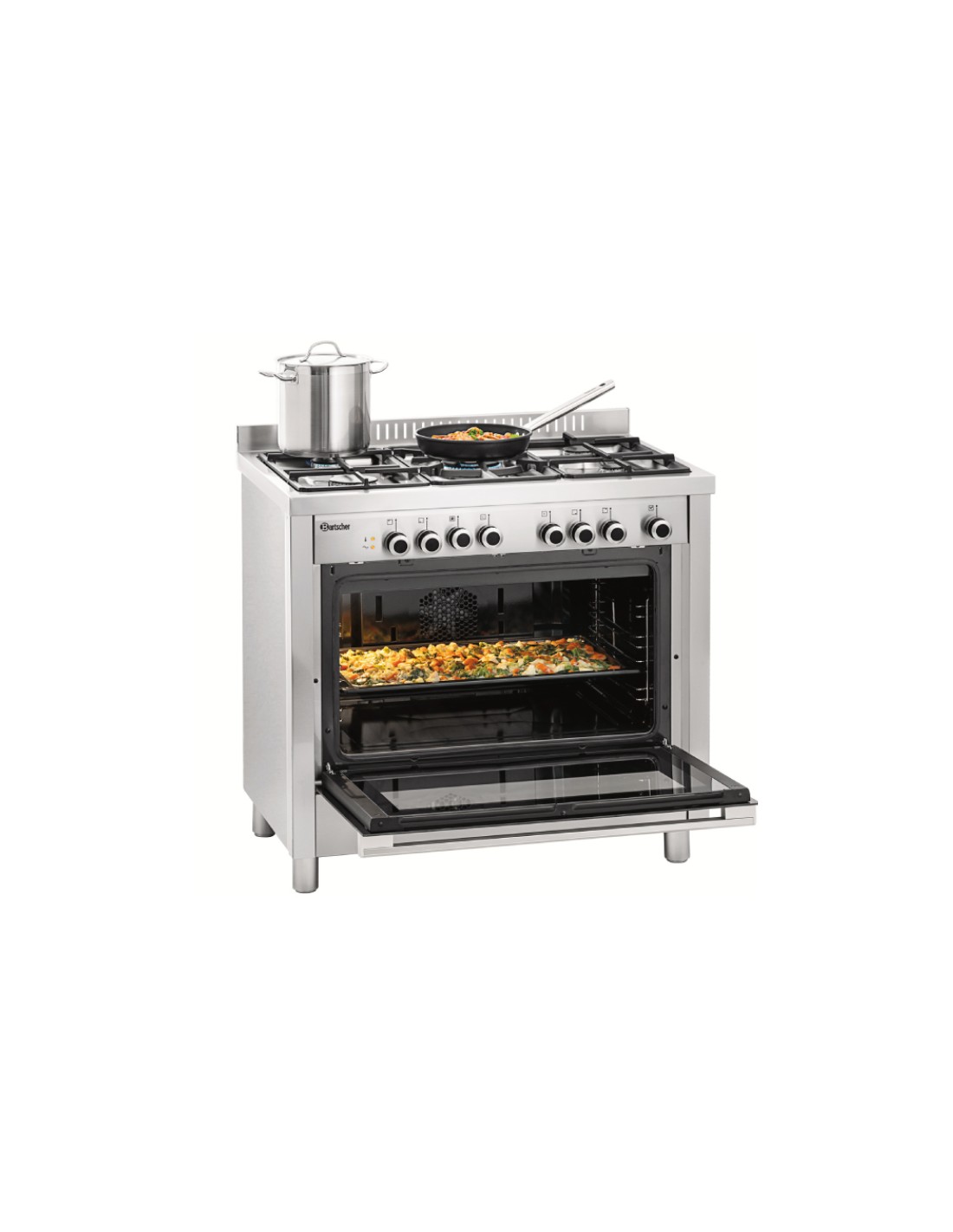 Cocina Profesional 5 Fuegos con Horno Bartscher, diseñada para un uso intensivo en cocinas de hostelería. Combina cinco zonas de cocción a gas con un horno eléctrico multifunción de gran capacidad, garantizando precisión, seguridad y versatilidad en cada preparación.