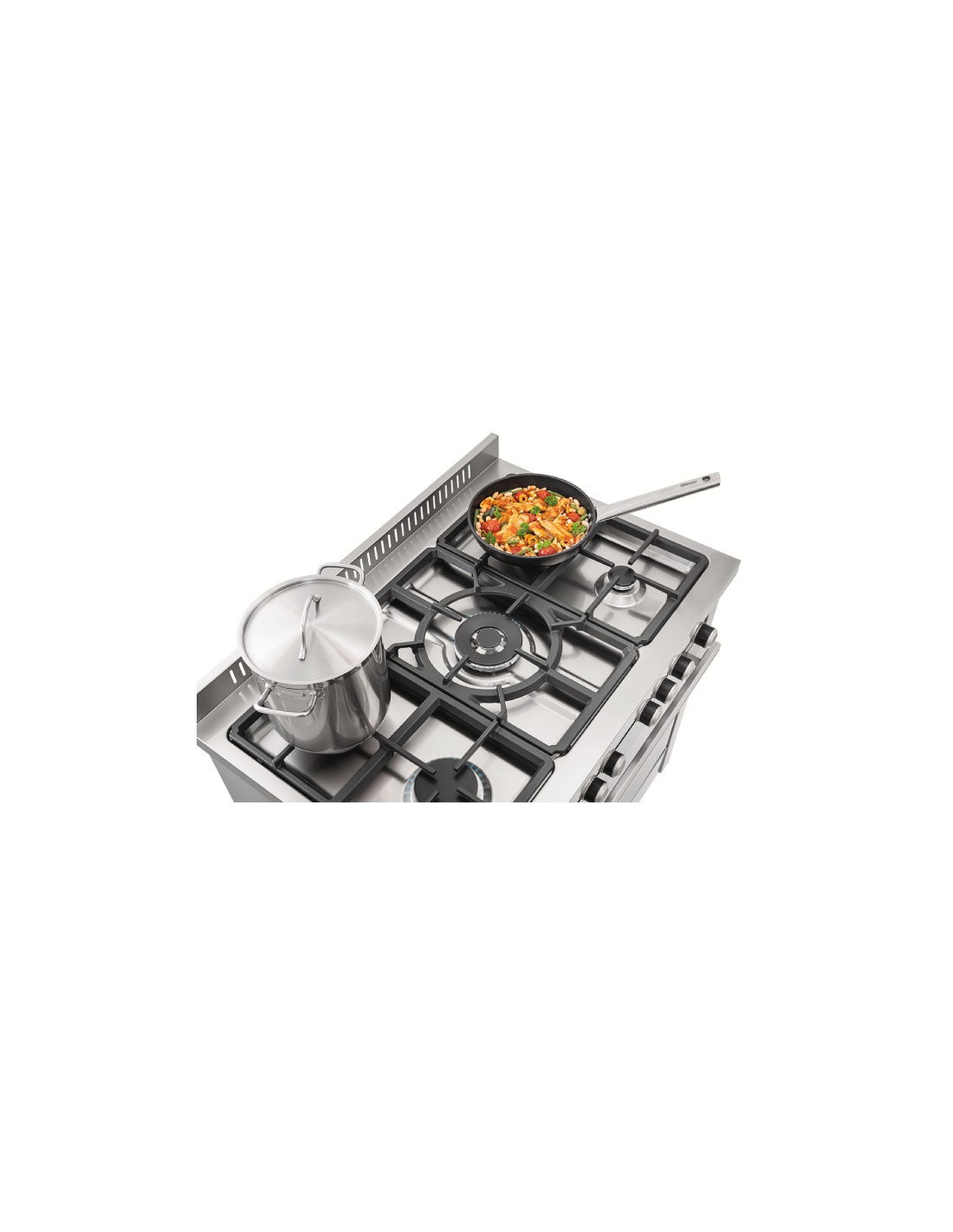 Cocina profesional a gas con 5 fuegos y horno eléctrico multifunción de 104 L. Potencia total 11,5 kW gas y 2,5 kW eléctrica. Rejillas de hierro fundido, encendido electrónico, puerta doble cristal y temporizador 55 min. Medidas: 900 × 650 × 920 mm.