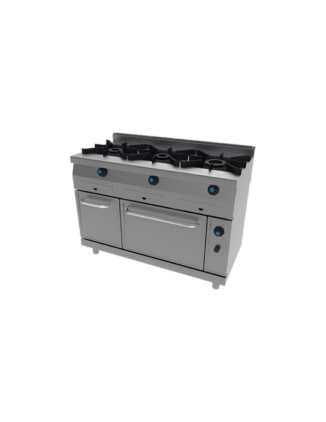 Cocina Industrial 3 Fuegos y Horno Jemi, perteneciente a la serie 600, diseñada para cocinas profesionales que requieren potencia elevada y estructura compacta. Incorpora encimera de 1,5 mm, quemadores de fundición con doble llama autoestabilizada y un horno integrado de alto rendimiento.