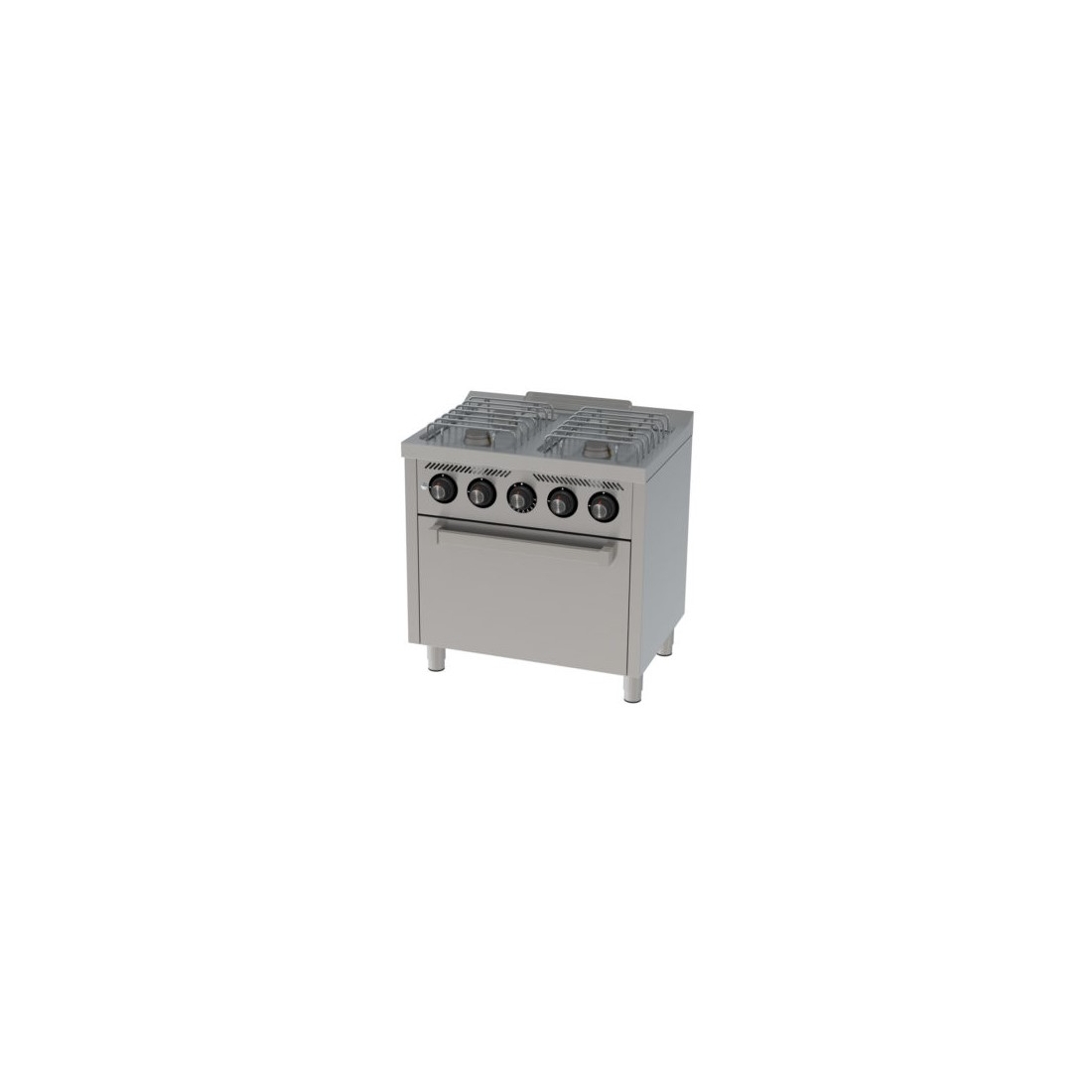Fogón industrial a gas con Horno. Cuenta con cuatro quemadores superiores de alto poder calorífico, doble corona y termopar de seguridad. El Horno se puede adquirir A gas o Eléctrico (Seleccionar antes de enviar a la cesta). Fabricación Española