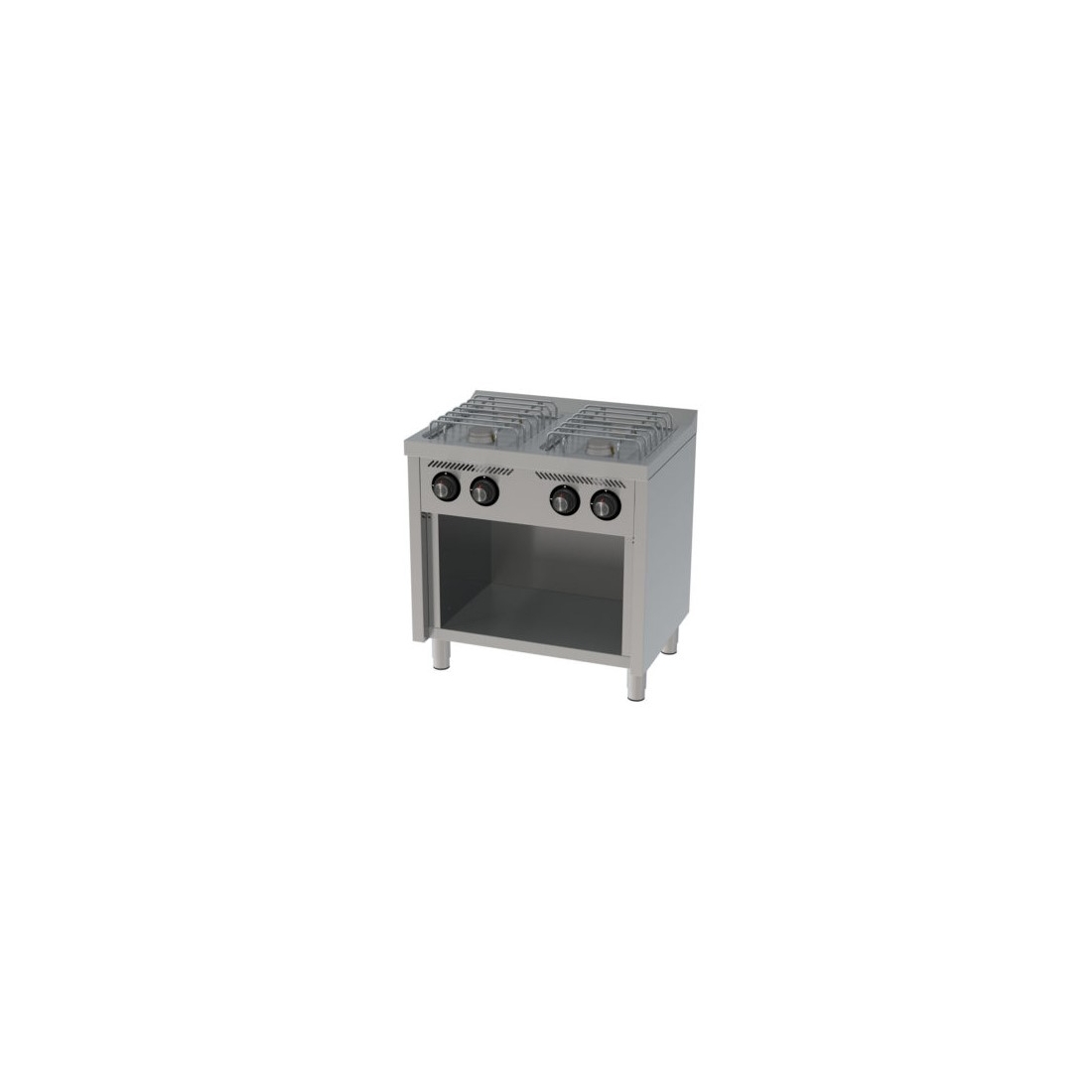 Fogón industrial a gas con Mueble y cuatro quemadores de alto poder calorífico, cuenta con una potencia de 22Kw, doble corona y termopar de seguridad. Fabricación Española