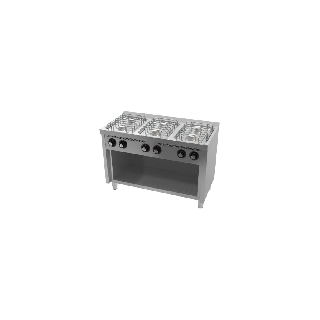 Fogón industrial a gas con Mueble y seis quemadores de alto poder calorífico, cuenta con una potencia de 33Kw, doble corona y termopar de seguridad. Fabricación Española