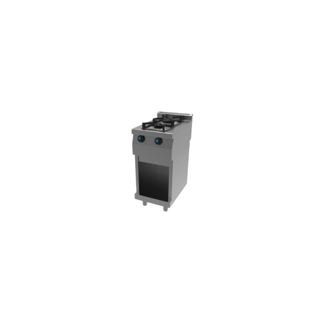 Fogón industrial a gas con mueble y estante dotado de dos quemadores con alto poder calorífico, cuenta con una potencia de: 15,3Kw, termopar de seguridad y llama piloto. Modelo con fondo 600. Fabricación Española