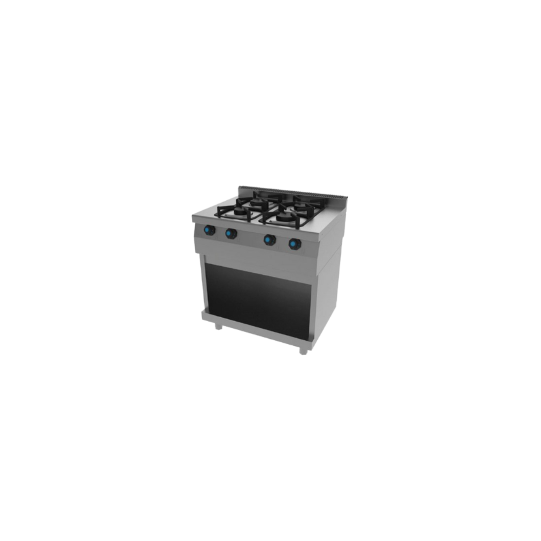 Cocina a gas industrial de cuatro quemadores con mueble. Cuenta con parrillas de hierro fundido de 370x300mm. Dispone de termopar de seguridad y llama piloto. Su encendido es piezoeléctrico. Fabricación Española