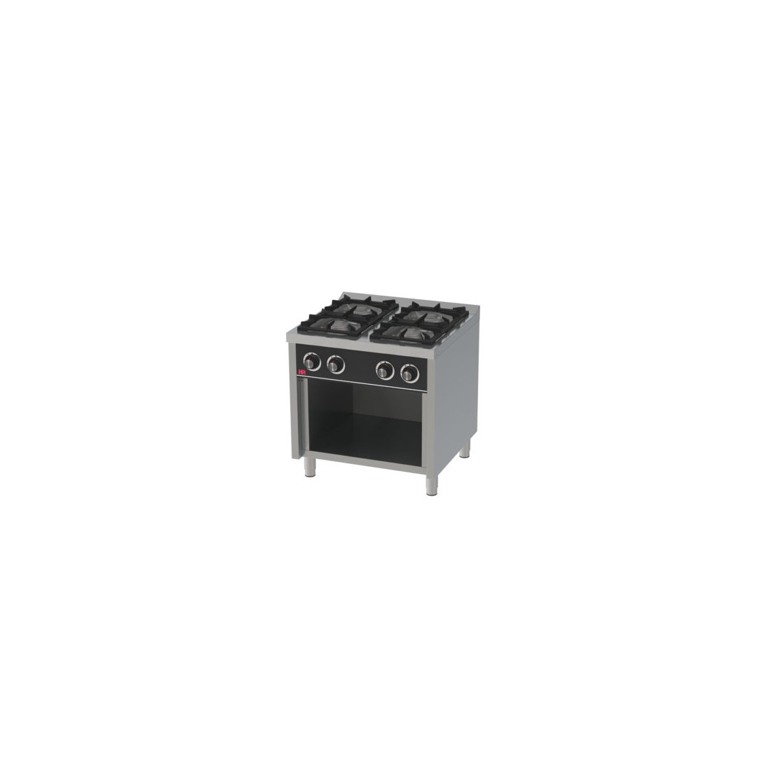 Fogón industrial a gas con mueble. Cuenta con 4 quemadores de alto poder calorífico, una potencia de 30,6Kw y termopar de seguridad. Modelo de Fondo 750mm. Fabricación Española