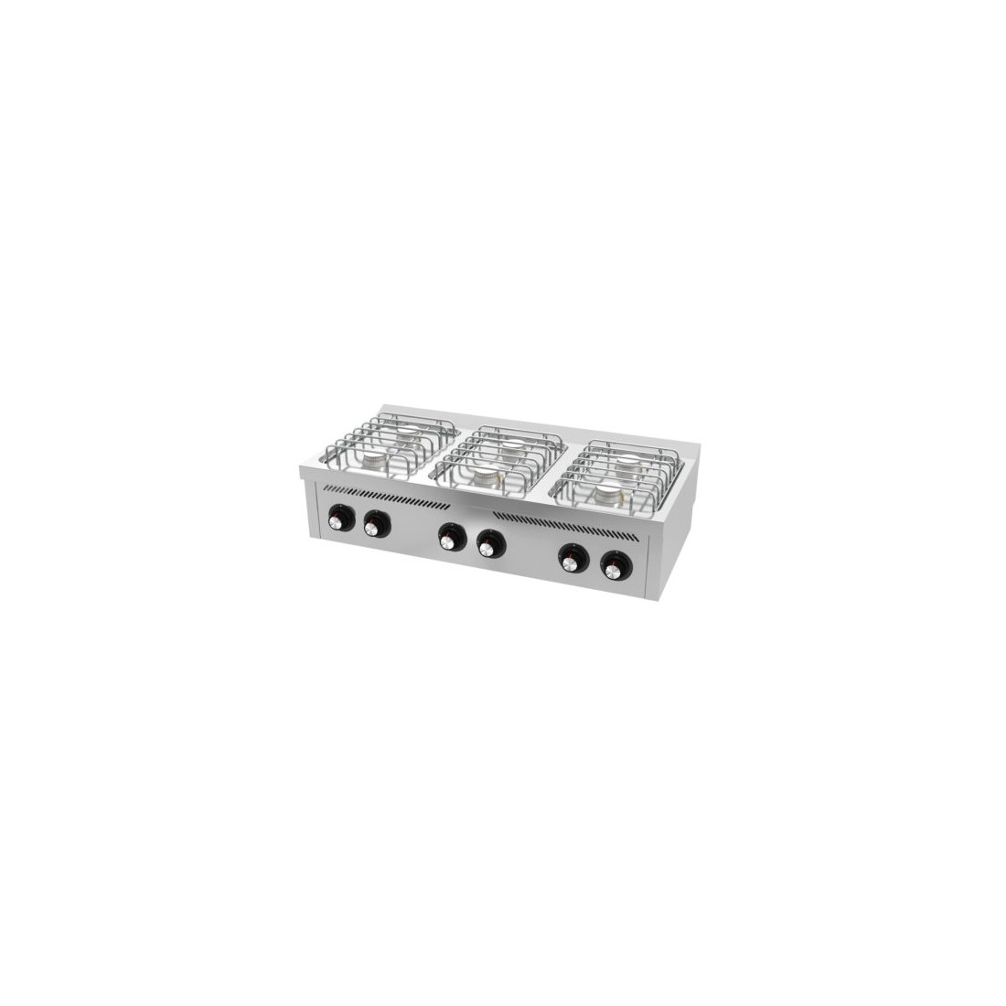 Fogón industrial a gas de sobremesa con seis quemadores de alto poder calorífico, cuenta con una potencia de 33Kw, doble corona y termopar de seguridad. Fabricación Española
