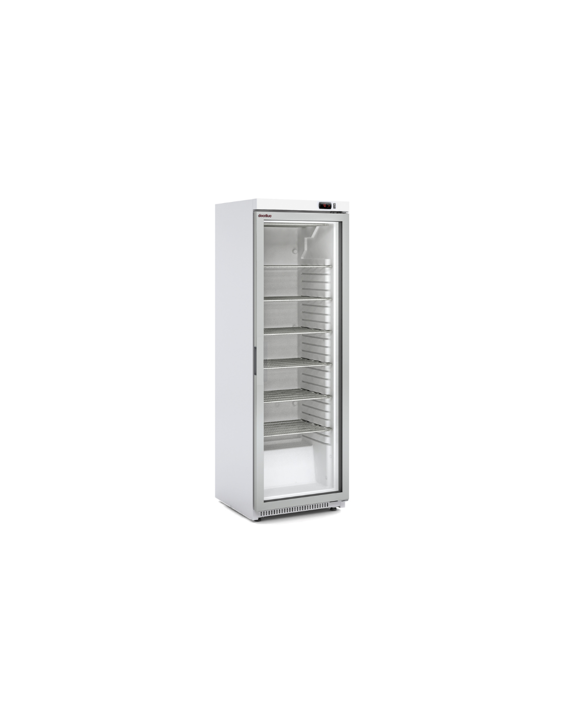 Armario Expositor Refrigerado, con puerta de cristal y cabezal iluminado. Tiene una capacidad de hasta 372 litros. Equipado con termómetro y control de la temperatura mecánico. El evaporador es estático asistido por ventilador. Incluye sistema de evaporación automático. Cuenta con luz LED y cristal doble templado. Capacidad: 455 latas de 33 cl.