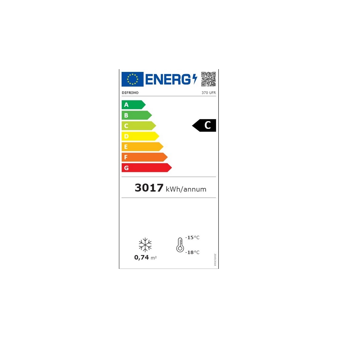 Armario Expositor Congelador 370 UFR de Difriho, eficiente para la conservación de productos congelados. Con unas dimensiones de 595 mm de ancho, 640 mm de profundidad y 1840 mm de altura, ofrece un amplio volumen de 300 litros y un rango de temperatura ajustable desde -12ºC hasta -22ºC.