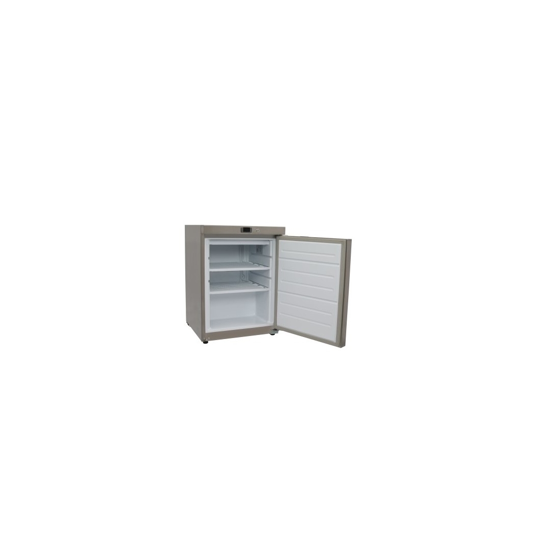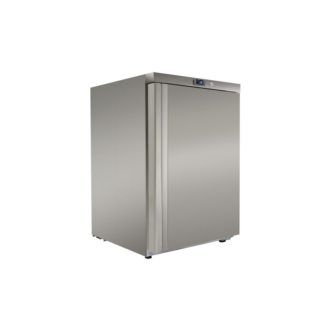 Armario de congelación de una puerta con capacidad de 140 litros, fabricado exteriormente en acero inoxidable. Desescarche manual. Frío estático en congelación. Sistema de condensación estático. Control electrónico digital de la temperatura y del desescarche DIXELL.