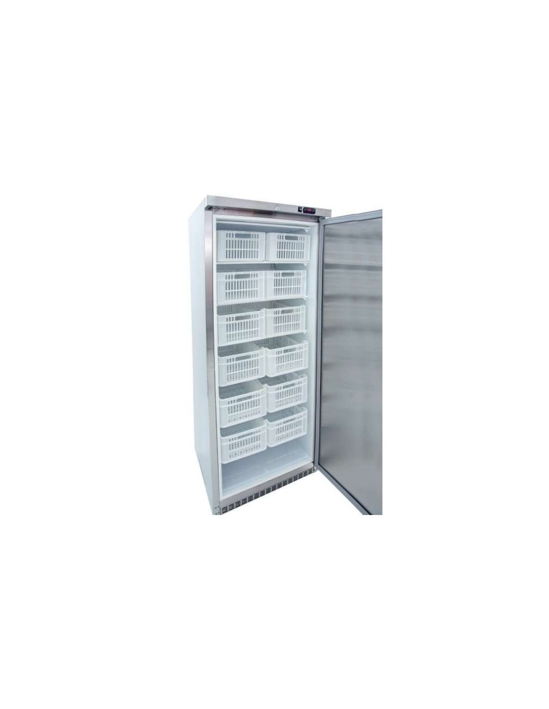 Armario congelador industrial de 600 litros con 12 cajones y refrigeración estática por estantes evaporadores. Rango de temperatura de –22 a –15 °C, control digital con desescarche automático y consumo anual de 954 kWh. Cuenta con 7 estantes evaporadores estáticos. Fabricado en España.