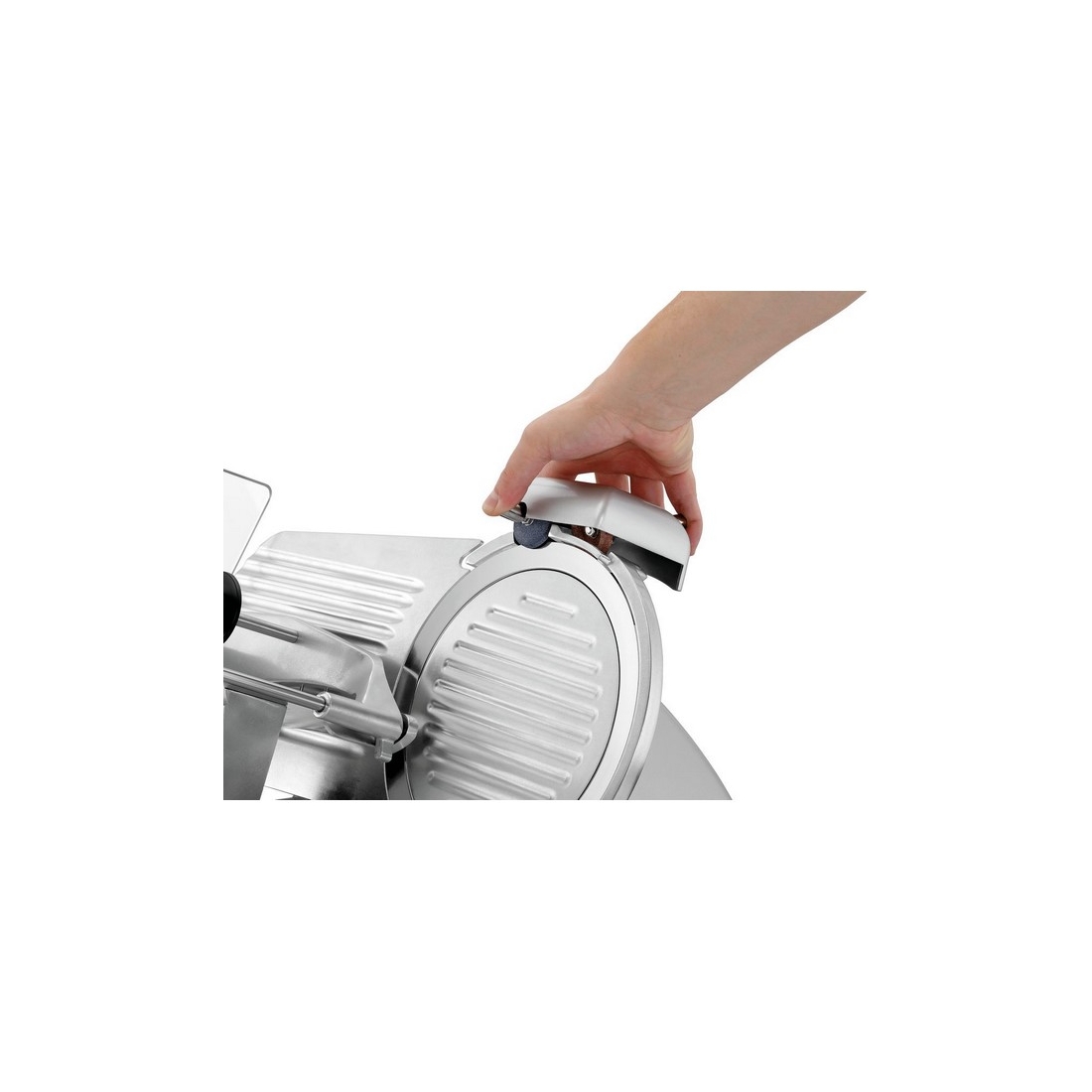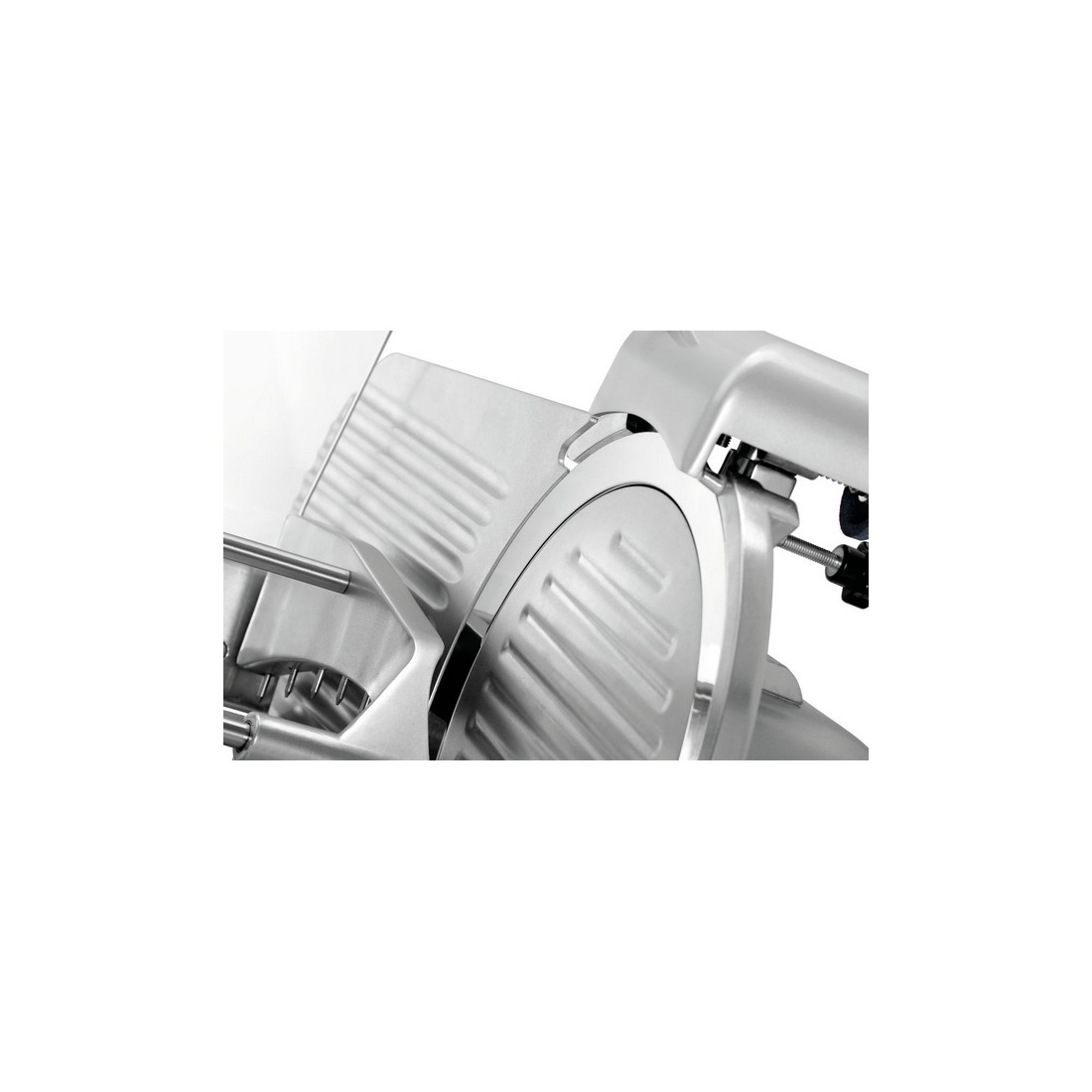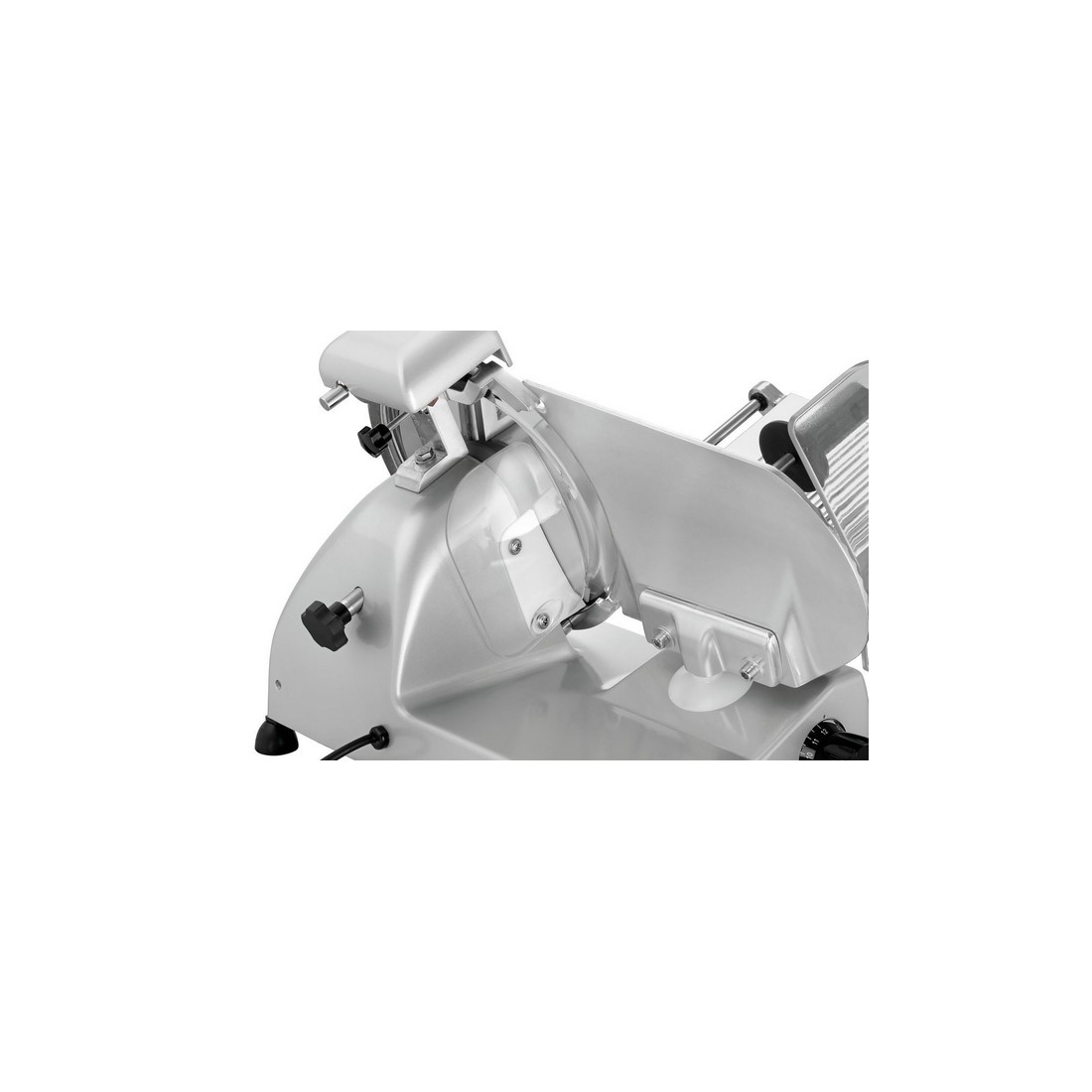 - El equipamiento de esta cortadora de fiambres cuenta con una cuchilla de 250 mm de diámetro, un soporte de alimentos, una cuchilla y una guía de corte, así como de una protección doble de cuchilla y un interruptor magnético para garantizar la seguridad.