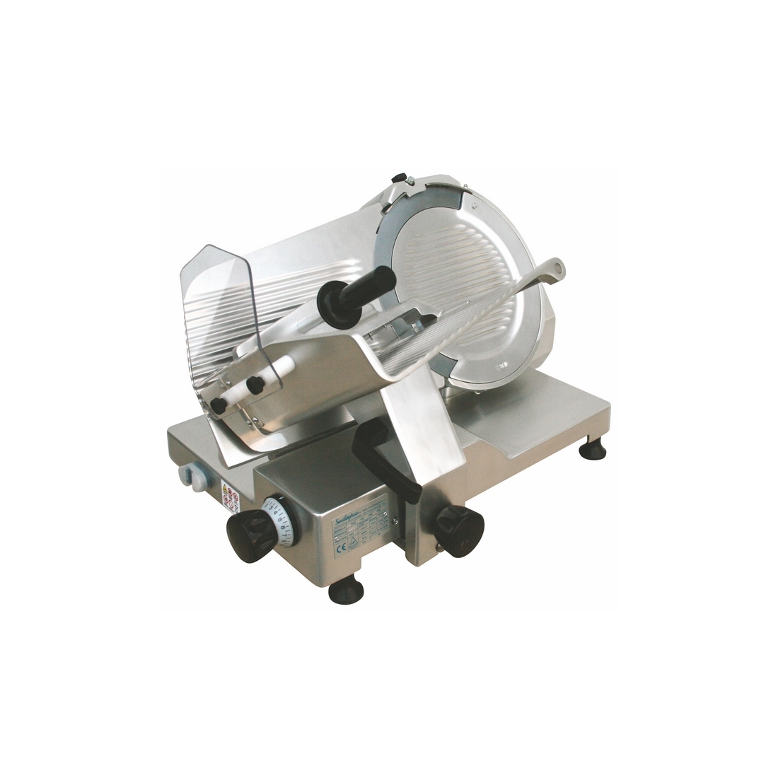 Cortadora de fiambre Italiana. Equipada con disco de 300 mm de diámetro. Construida en aleación de aluminio fundido barnizado. Incluye anillo protege cuchillas y tiene un corte útil de 210 x 240 mm. Potencia 280 W.