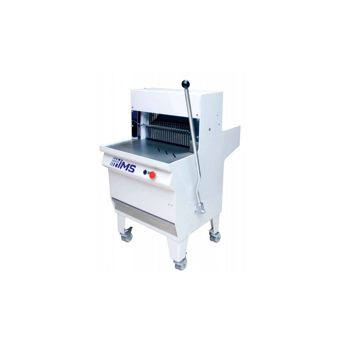 Rebanadora de pan industrial con un corte máximo de 50cm. Modelo de mueble con palanca empujadora. Está diseñada para cortar rebanadas de pan de 15mm y cuenta con una altura máxima de 14cm.