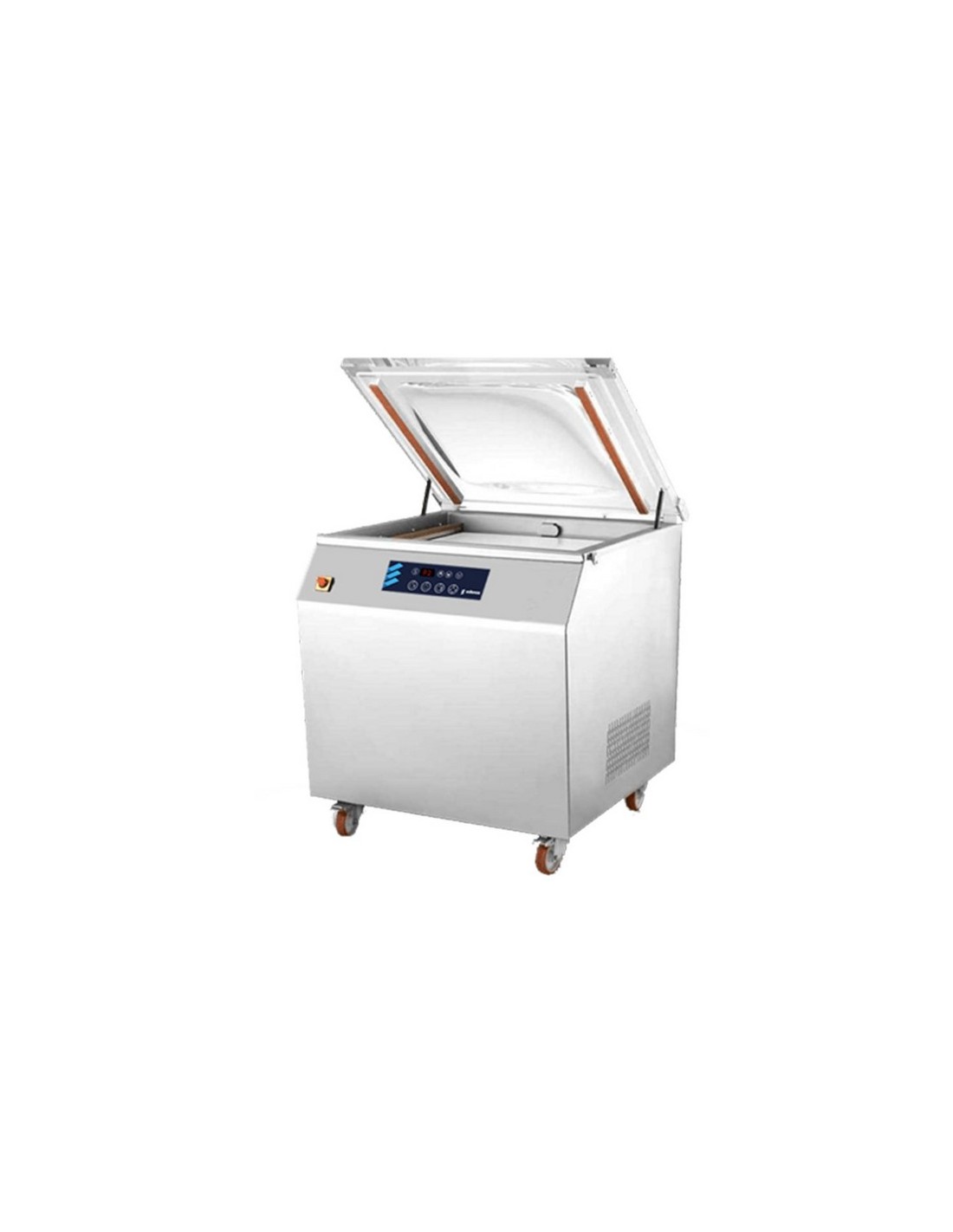 Envasadora al vacío de suelo controlada por sensor con dos barras de soldadura de 450 mm. Cuenta con bomba de vacío de 20m3/h y panel de control digital. Bomba Busch.