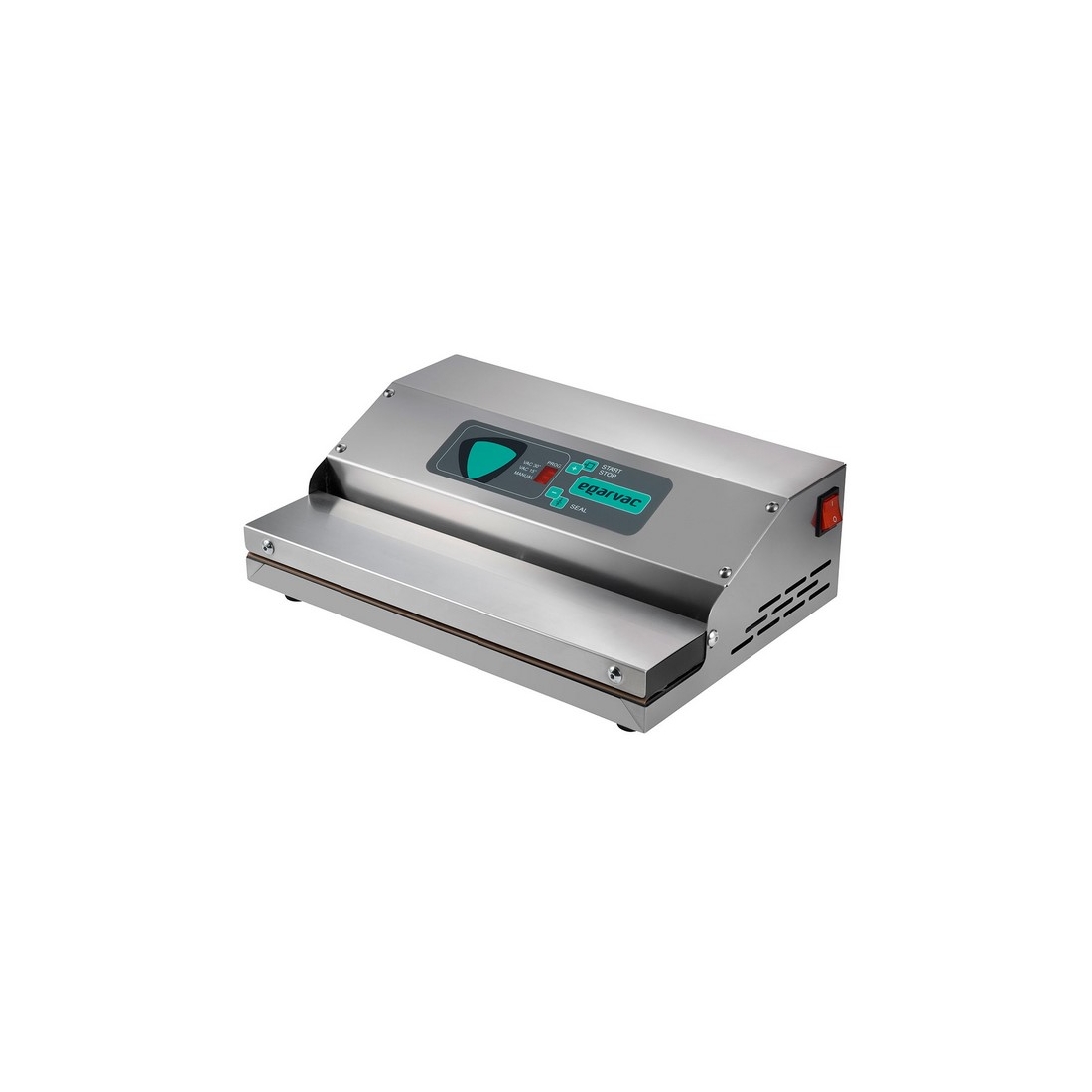 Envasadora de vacío externo, con tres programas de trabajo preconfigurados seleccionables, dos de vacío + sellado y uno de vacío discrecional + sellado. Indicación de programa activo. Regulación del tiempo de soldadura.