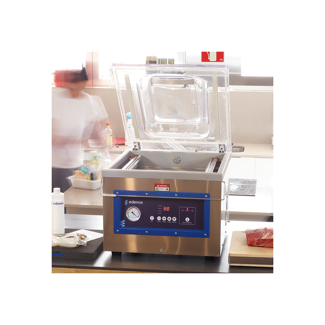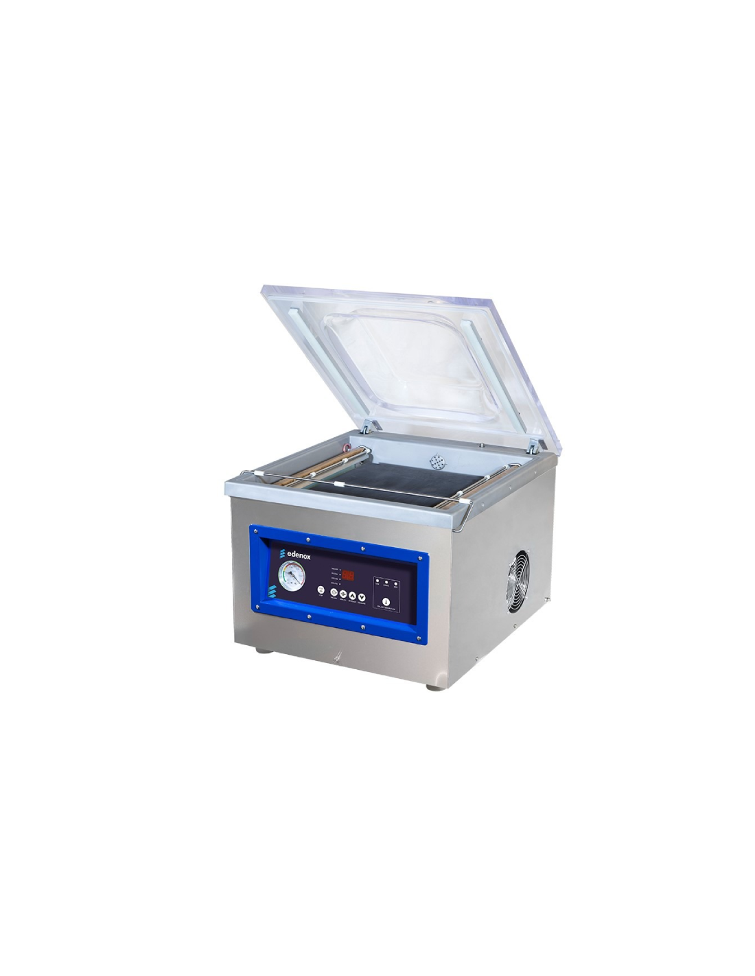 Envasadora al vacío de sobremesa de la serie Vaksic E de Edenox, controlada por tiempo con doble barra de soldadura de 50cm. Dispone de bomba de vacío de 20m3/h y panel de control digital.