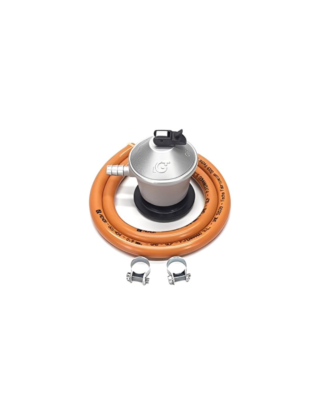El regulador fija la presión de salida del gas a un valor estable (30 mbar) mientras la manguera y abrazaderas garantizan un paso seguro hacia el equipo conectado.
