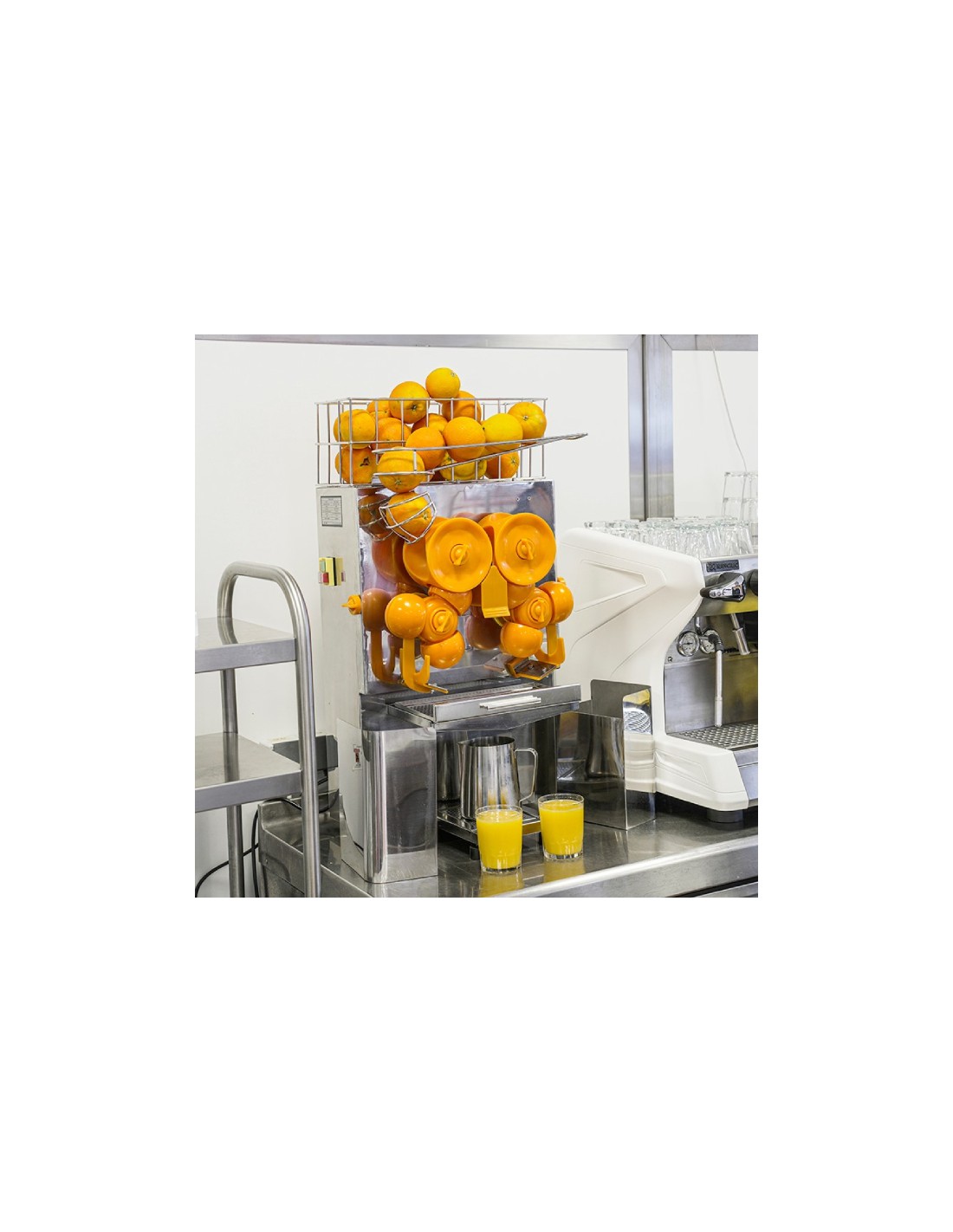 Exprimidor industrial automático con capacidad de 20 frutas/min, motor 200 W y cuerpo en acero inoxidable. Admite cítricos de 55–80 mm, con doble depósito para cáscaras, cubierta de policarbonato y bandeja antigoteo. Medidas 400×300×780 mm.