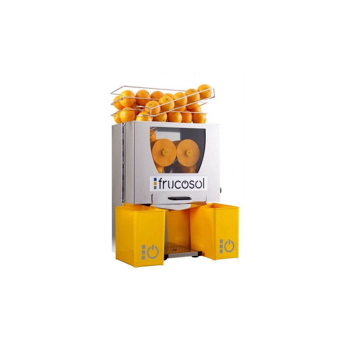 Exprimidor industrial de zumos automático, admite naranjas de 40-80 mm de diámetro con una salida de 20 naranjas por minuto. Construido en acero inoxidable con cubierta de policarbonato transparente.