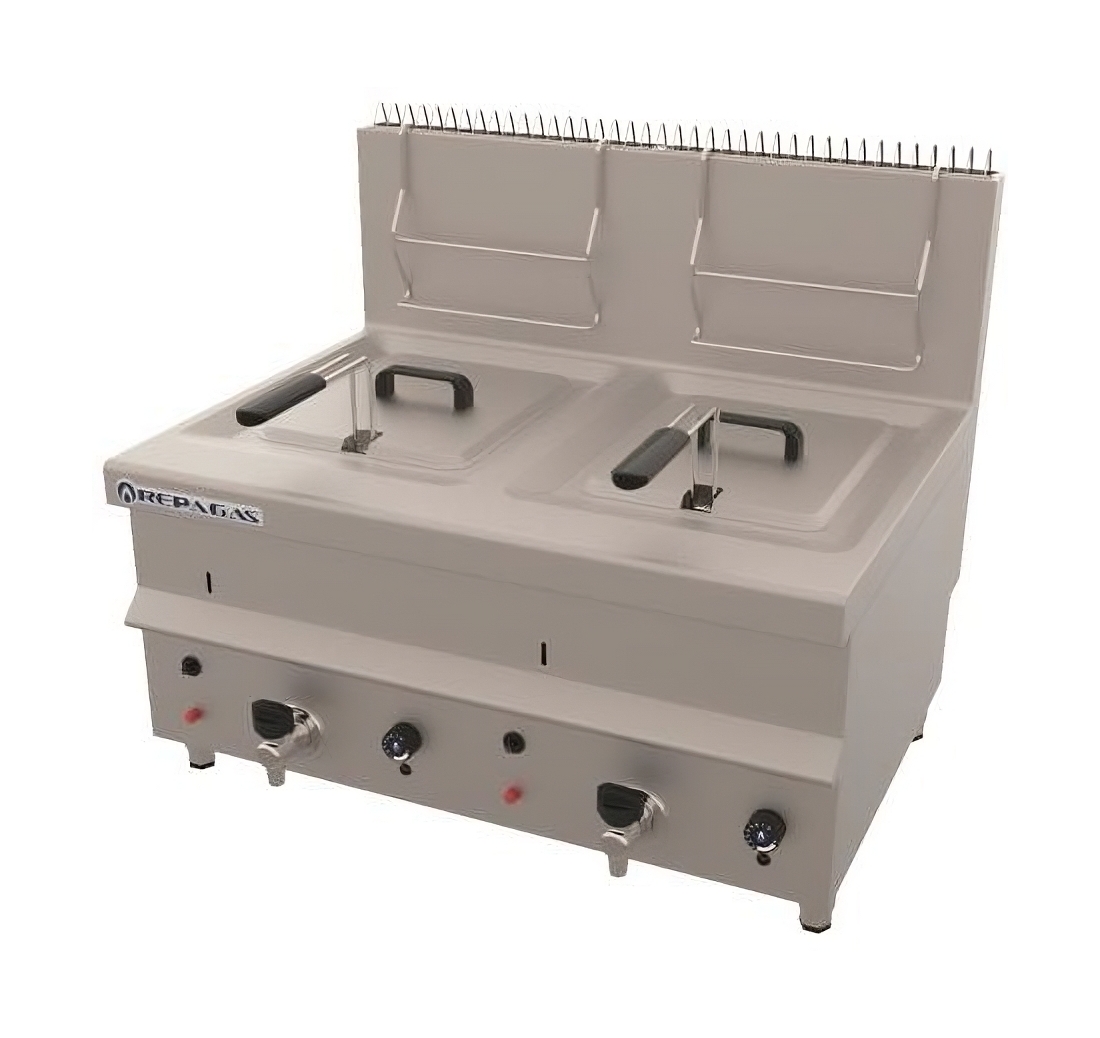Freidora industrial a gas de doble seno, con capacidad de 17 + 17 litros y valida para trabajar con butano / propano. Cuenta con grifo de drenaje.