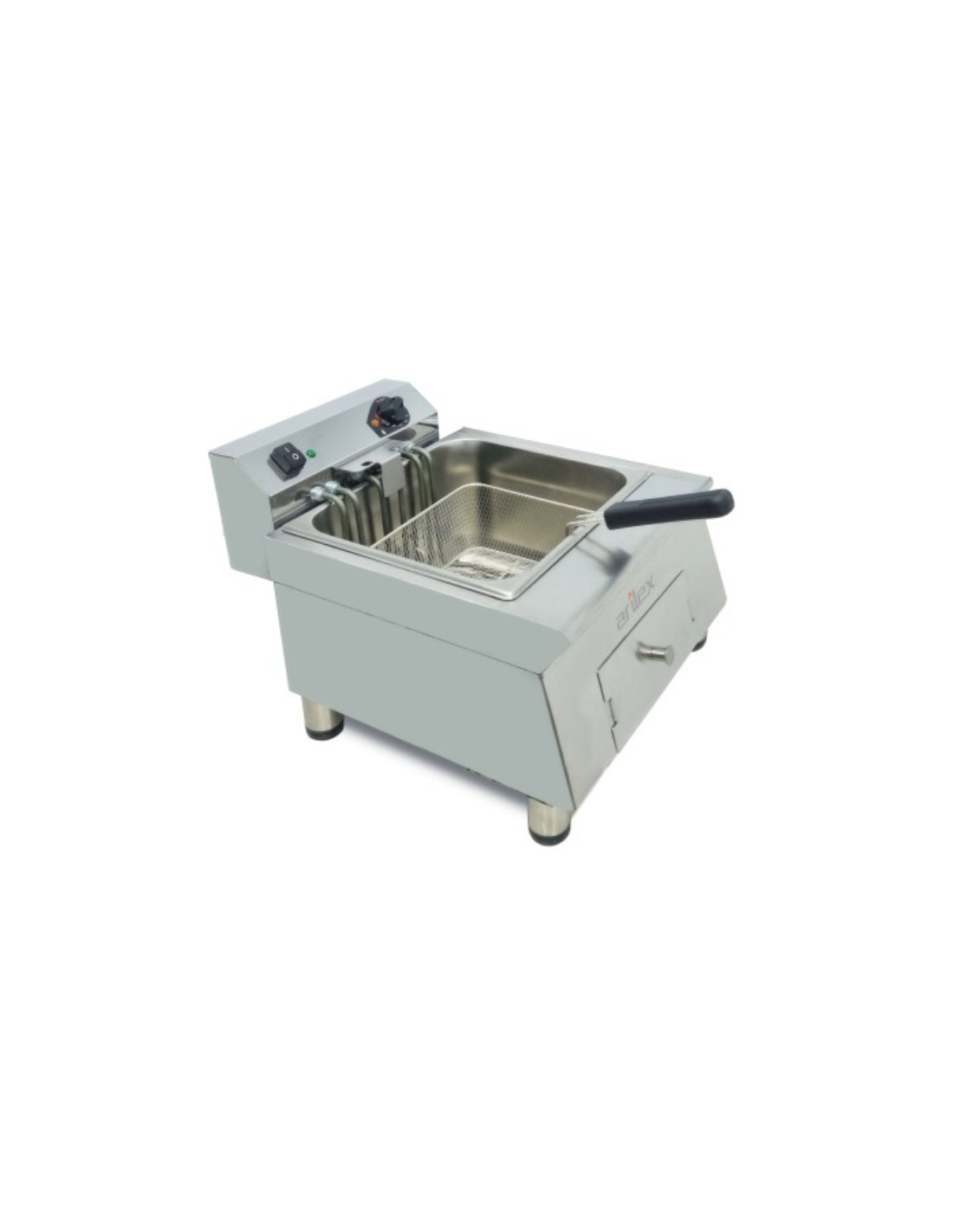 Freidora Industrial Electrica 10 Litros Arilex, diseñada para cocinas profesionales que requieren un equipo compacto, potente y de mantenimiento sencillo. Su cuba embutida sin ángulos, la resistencia blindada y el sistema de desagüe inferior garantizan un trabajo continuo y eficiente en hostelería.
