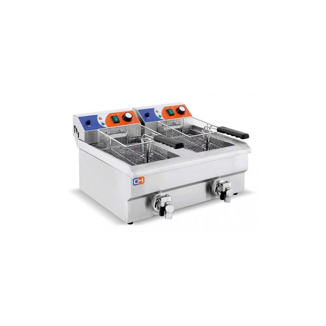 Freidora eléctrica 12+12l EF-162V de Clima Hostelería, esta equipada con termostato de bulbo inoxidable muy sensible, que desconecta la corriente cuando el aceite alcanza la temperatura deseada. Se puede desmontar completamente sin usar herramientas para su fácil limpieza y mantenimiento. Cuenta con un segundo termostato de seguridad regulado a 210ºC.