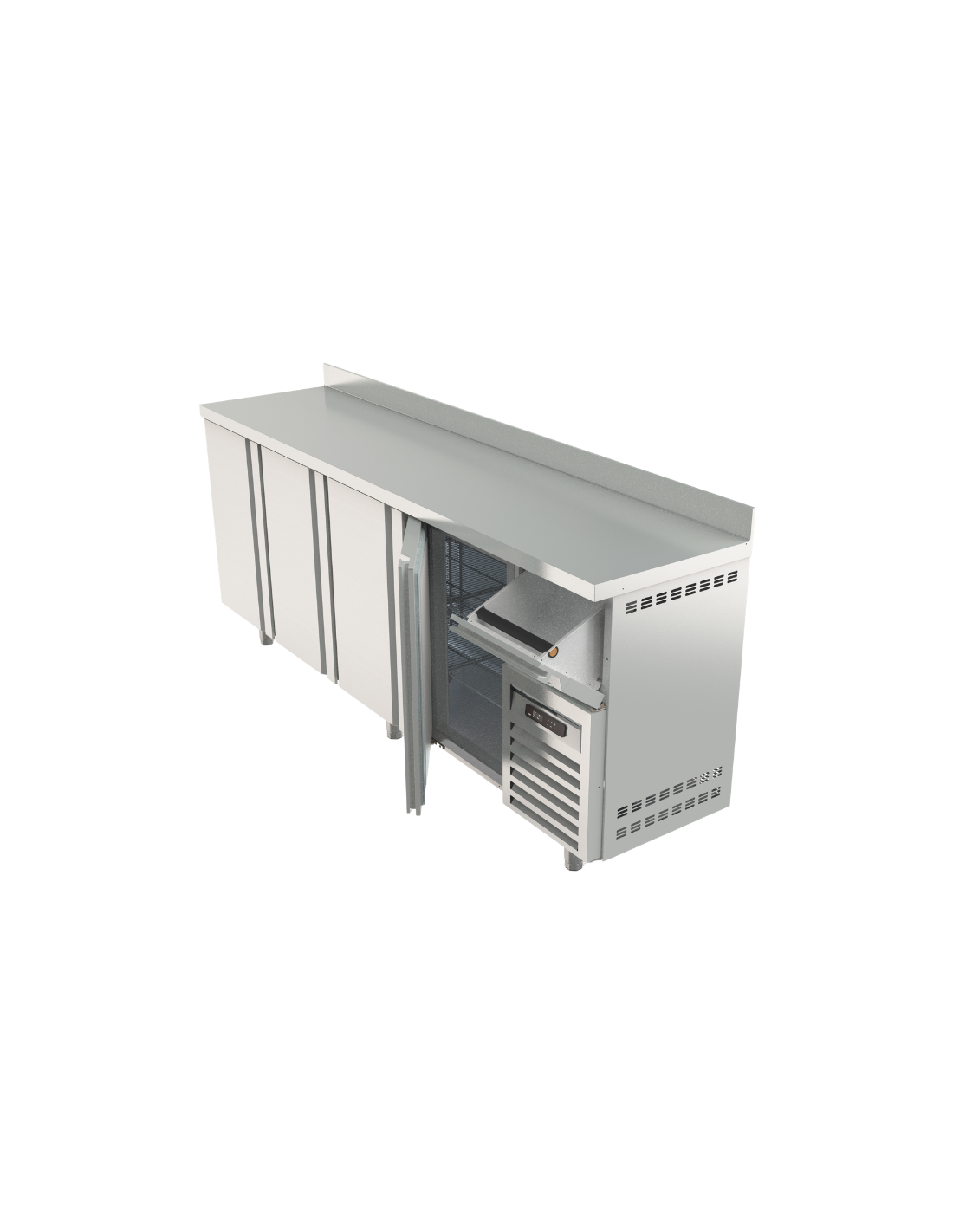Frente mostrador refrigerado de 3 puertas con capacidad de 504 litros y temperatura de trabajo de -2 °C a +8 °C. Equipado con refrigeración ventilada, control digital de temperatura y desescarche automático. Construcción interior y exterior en acero inoxidable AISI-304 con 3 puertas y 6 estantes regulables. Medidas: 2020 x 600 x 1040 mm.