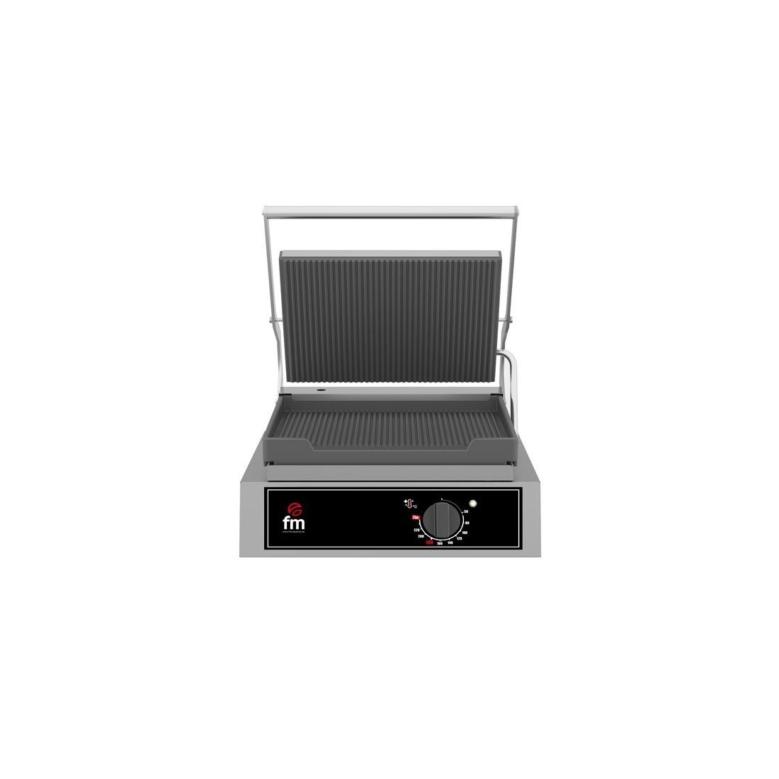Grill Profesional Pequeño GR1 FM Industrial, ideal para negocios que necesiten implementar el servicio de bocadillos pero dispongan de poco espacio, o demanda. La superficie inferior y superior son acanaladas.