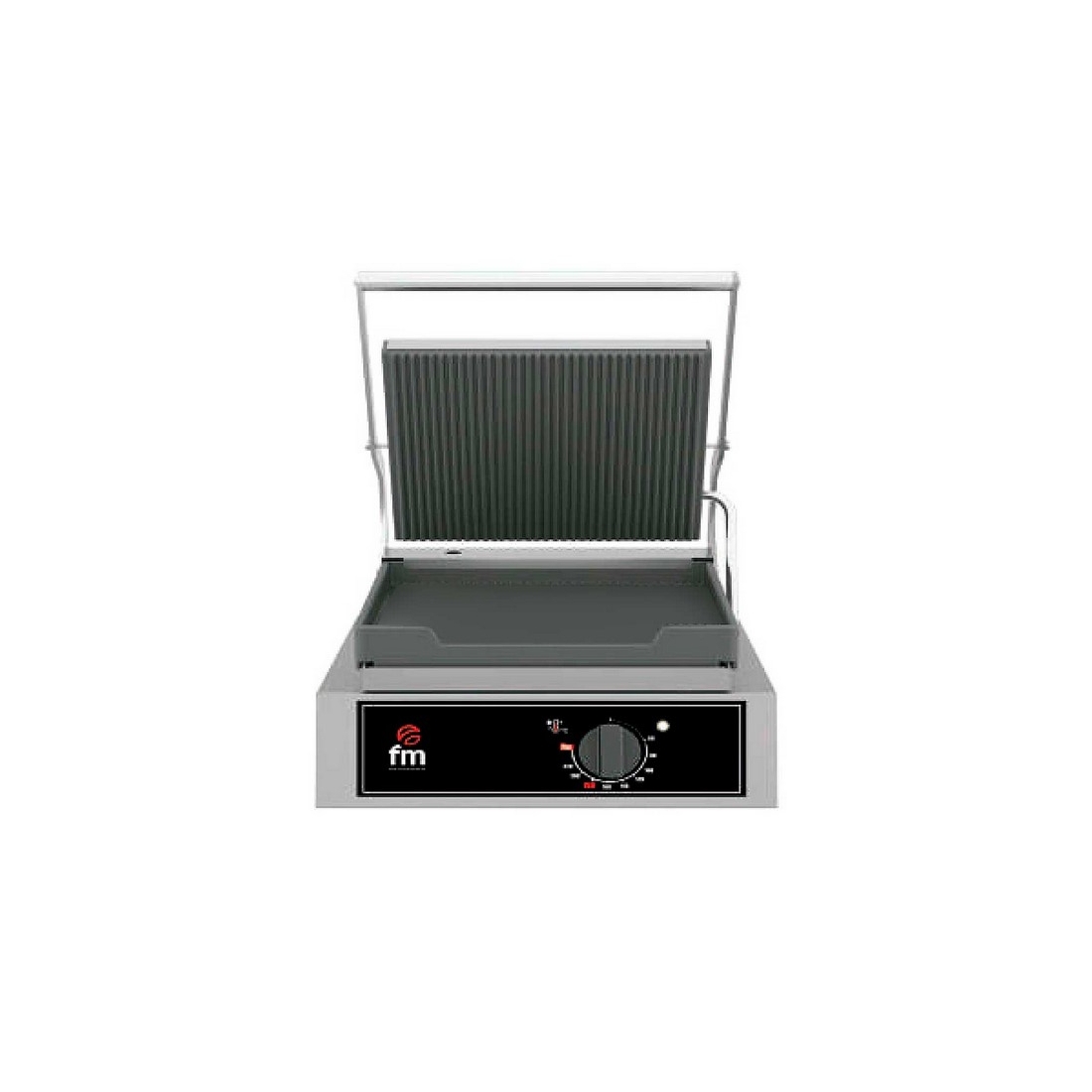 Grill eléctrico mediano de un solo cuerpo construido en acero inoxidable de alta eficiencia térmica. Las placas son esmaltadas y acanaladas. Tiene un rango de temperatura de 50ºC a 300ºC. Incluye cajón recoge grasas.