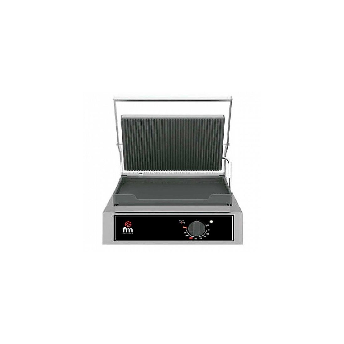 Grill eléctrico mediano de un solo cuerpo construido en acero inoxidable de alta eficiencia térmica. Las placas son esmaltadas y acanaladas. Tiene un rango de temperatura de 50ºC a 300ºC. Incluye cajón recoge grasas.