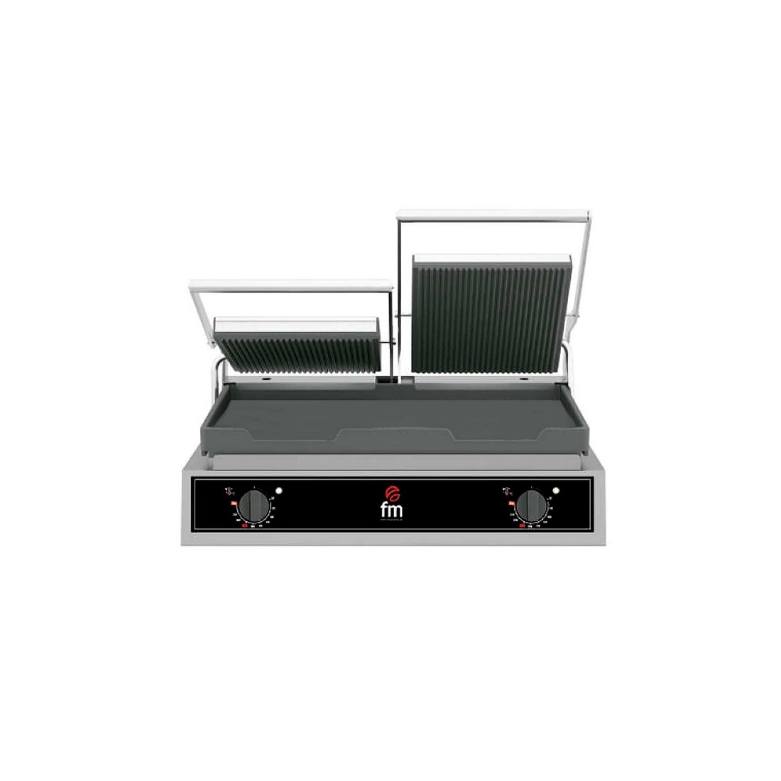 Grill eléctrico grande de doble cuerpo. Cuenta con 2 termostatos regulables independientes con una regulación de 50ºC a 300ºC. Dotado con placas esmaltadas y acanaladas. Es ideal para preparar carne, bocadillos, paninis o verduras. Potencia: 3,6Kw. Aprovecha nuestros ¡ENVIOS GRATUITOS!