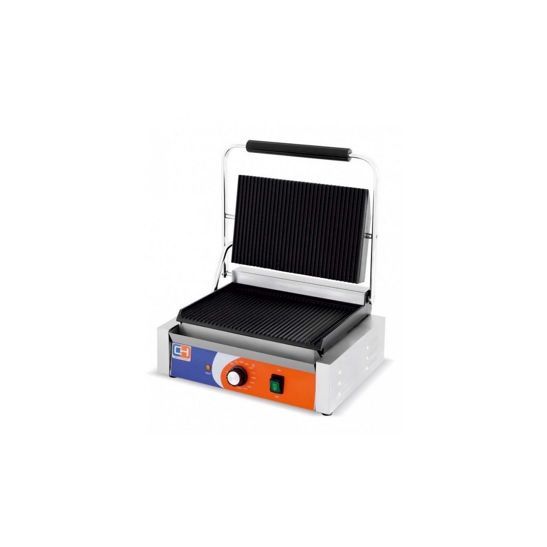 Grill eléctrico mediano PG-812 de Clima Hostelería, de un solo cuerpo construido en acero inoxidable. Este modelo de Grill cuenta con placas esmaltadas y acanaladas. Tiene un termostato regulable con un una temperatura máxima de hasta 300ºC.