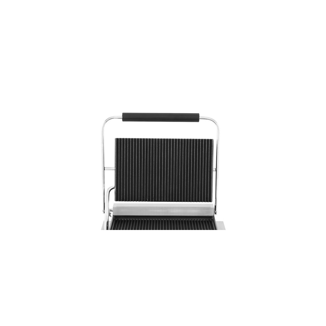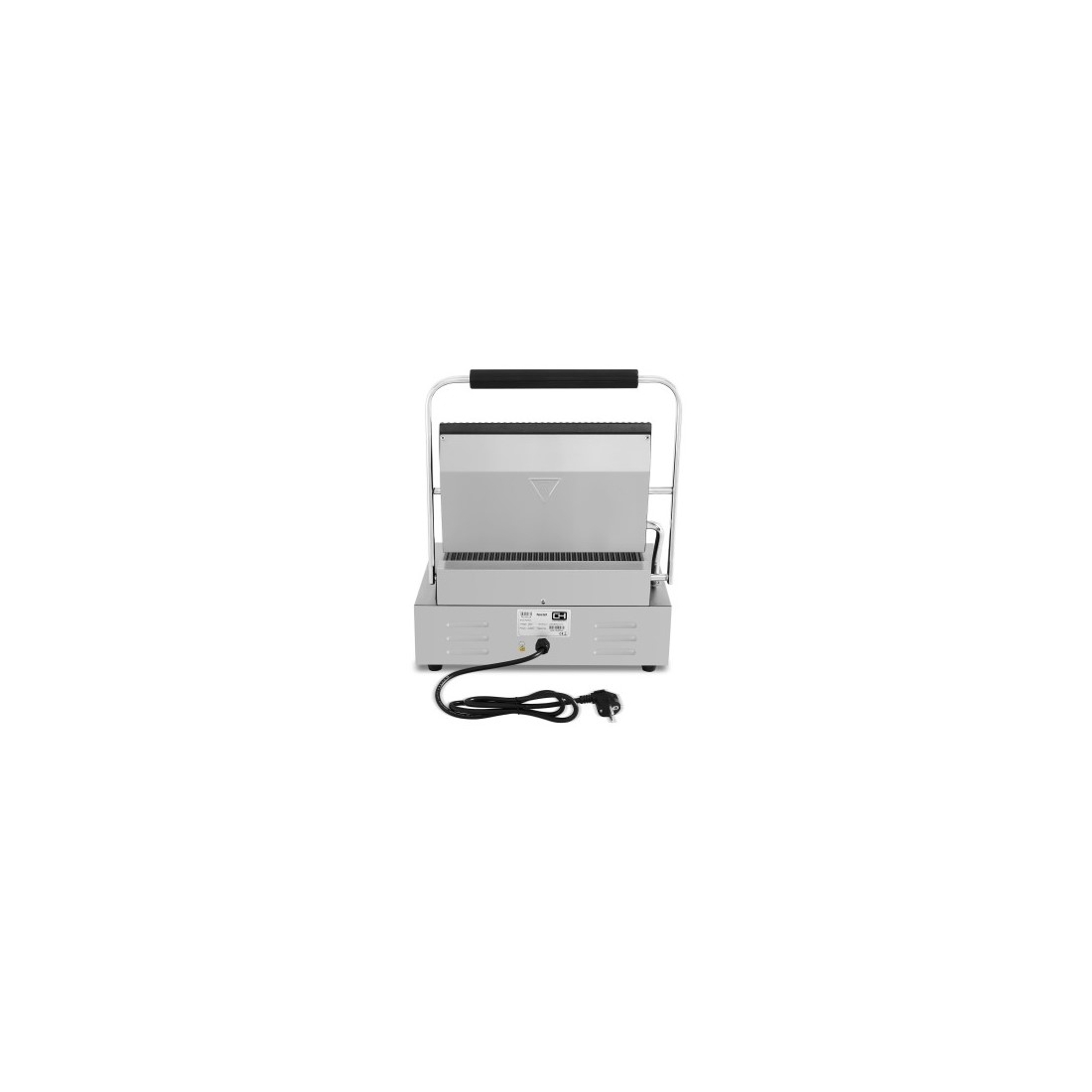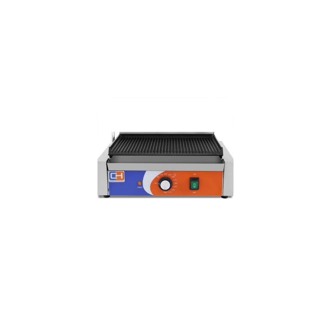 Grill profesional para hostelería de funcionamiento eléctrico con unas medidas de placa: 36 x 24cm. Termostato regulable: 50ºC a 300ºC. Placas acanaladas. Modelo de alta potencia: 2.200W.