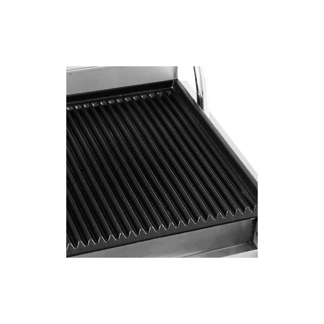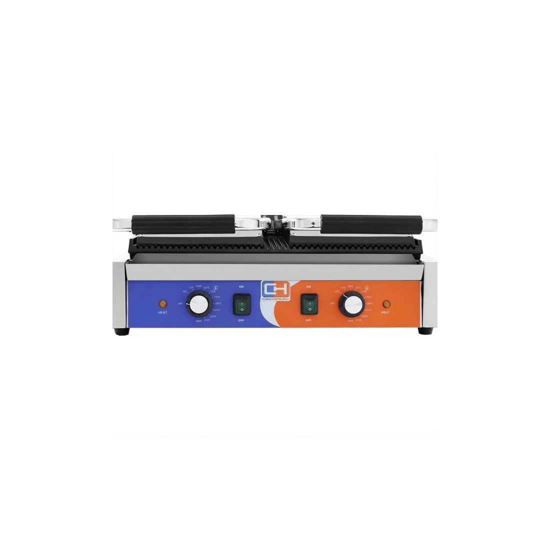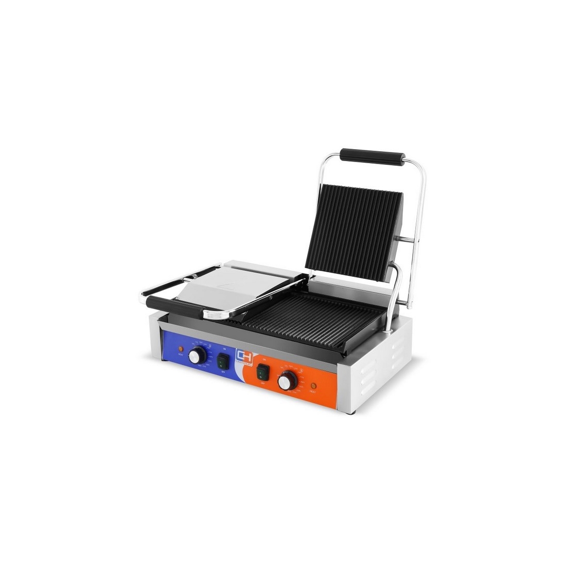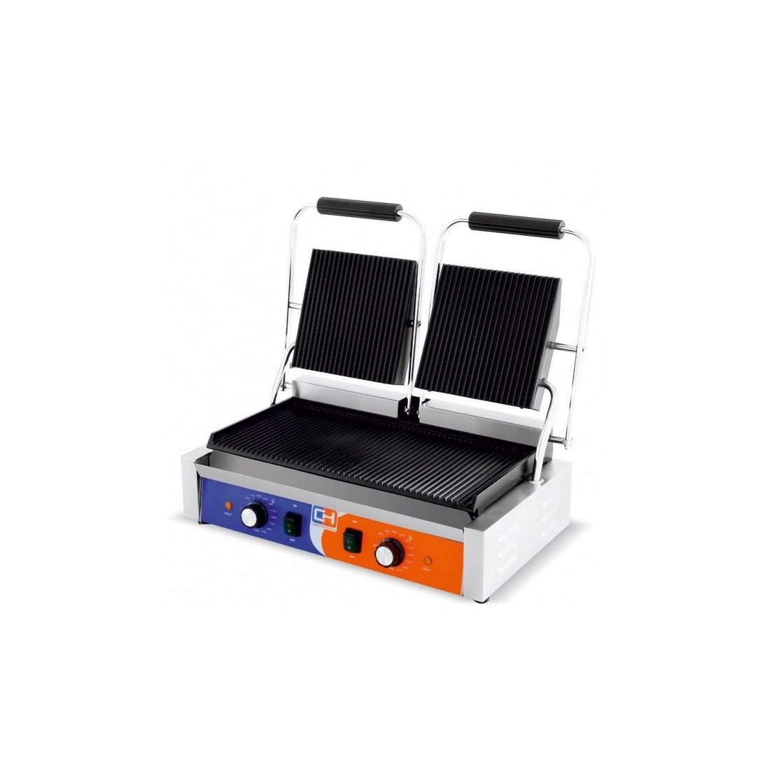 Grill eléctrico grande de doble cuerpo. Cuenta con 2 termostatos regulables independientes con una regulación de 50ºC a 300ºC. Dotado con placas esmaltadas y acanaladas. Es ideal para preparar carne, bocadillos, paninis o verduras. Potencia: 3,6Kw. Aprovecha nuestros ¡ENVIOS GRATUITOS!
