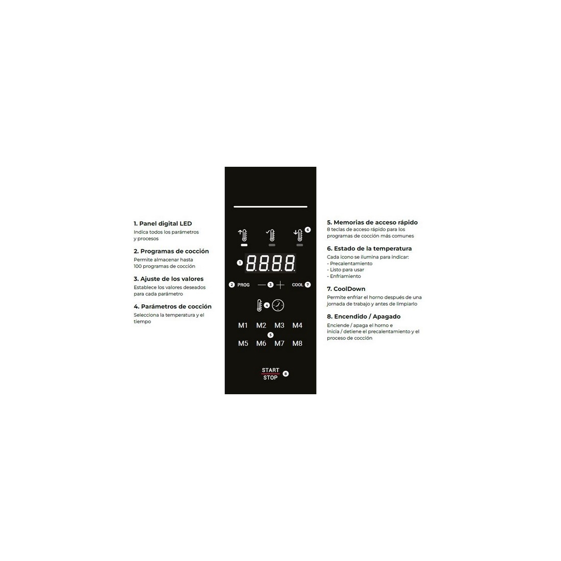 Este horno cuenta con una pantalla digital desde la que se programan todas sus funciones. Entre ellas usa un sistema de precalentamiento ultra rápido, CoolDown (Sistema de enfriamiento después del uso), tres fases de cocción, y mucho mas. Potencia: 3,6Kw. Conexión remota por Wifi. Disponible en Negro y Rojo.