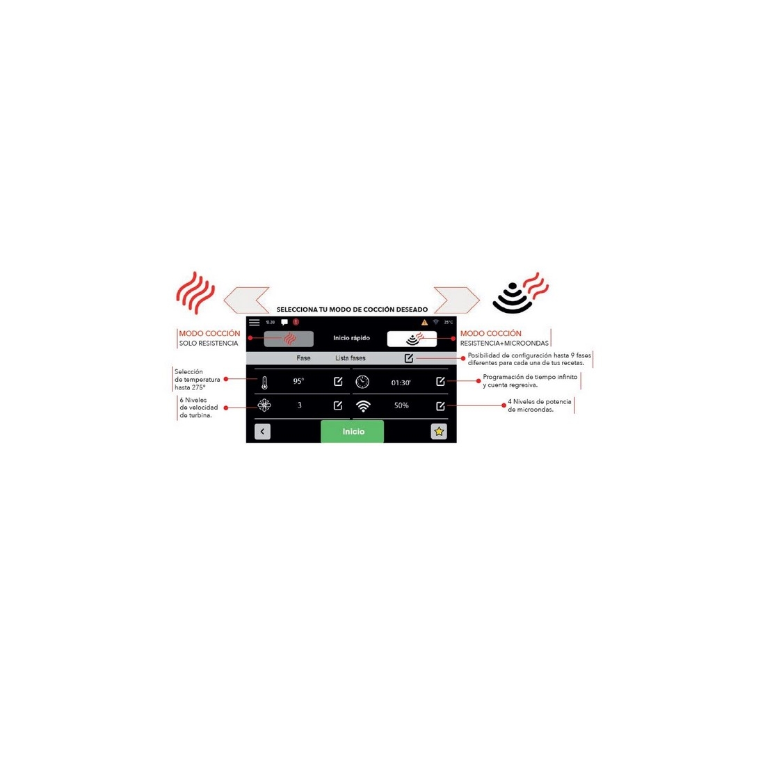 - Modo mantenimiento integrado (horno siempre listo para cocción)