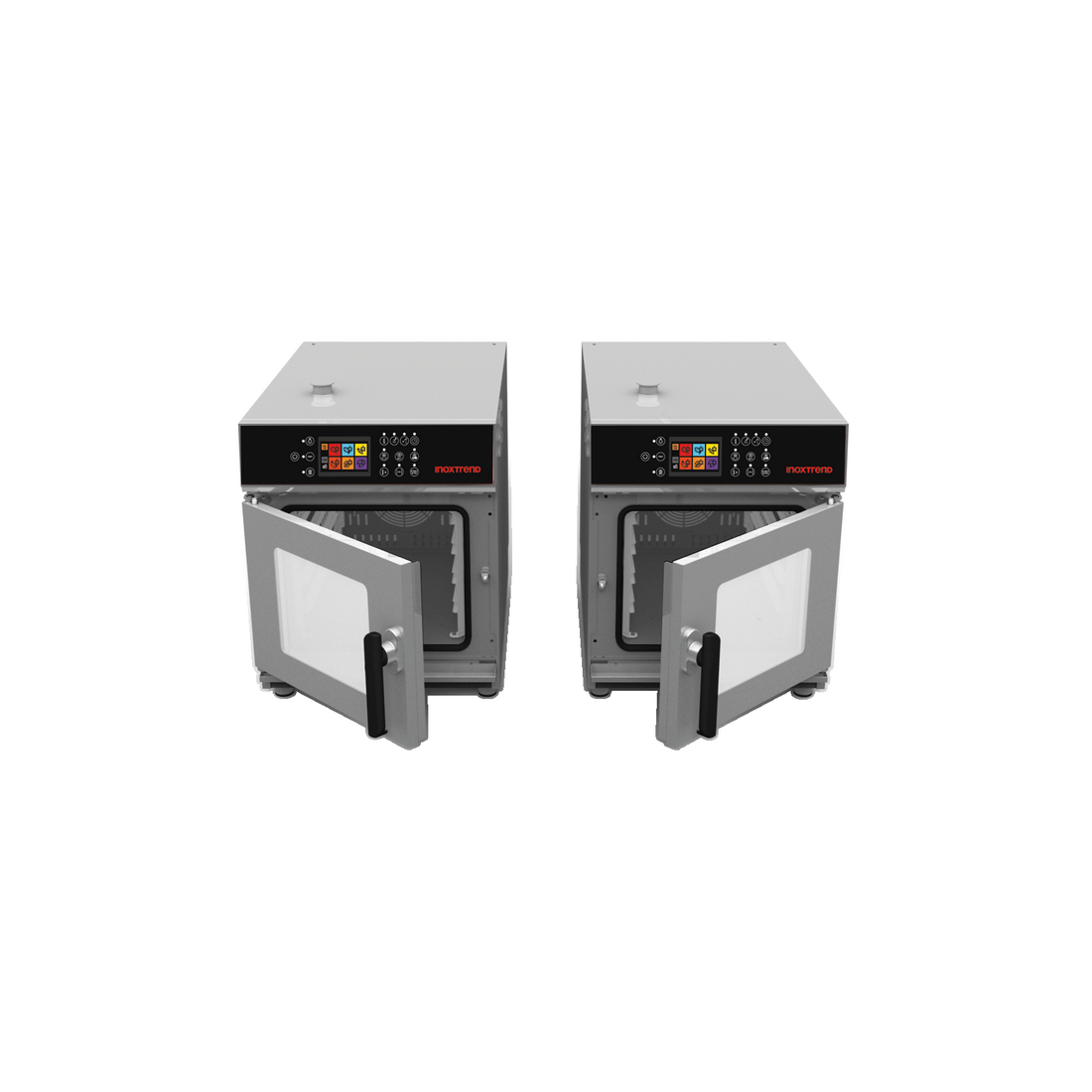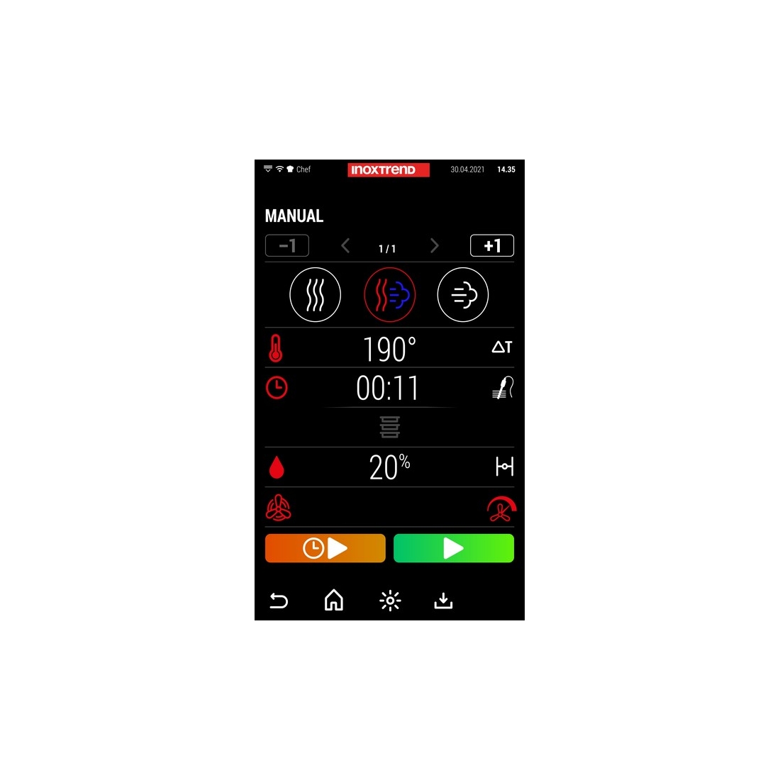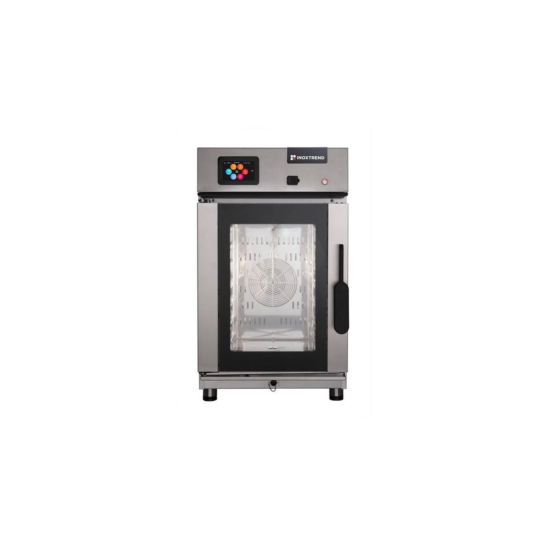 Horno compacto de gastronomía 4 bandejas GN 1/1, con pantalla táctil muy intuitiva desde la que podrás dirigir funciones muy interesantes como: Lavado automático, dos velocidades de ventilación, almacenamiento de programas, precalentamiento automático, función cook and hold... Además incluye sonda al corazón de serie. Potencia: 5,2Kw, Trifásico.