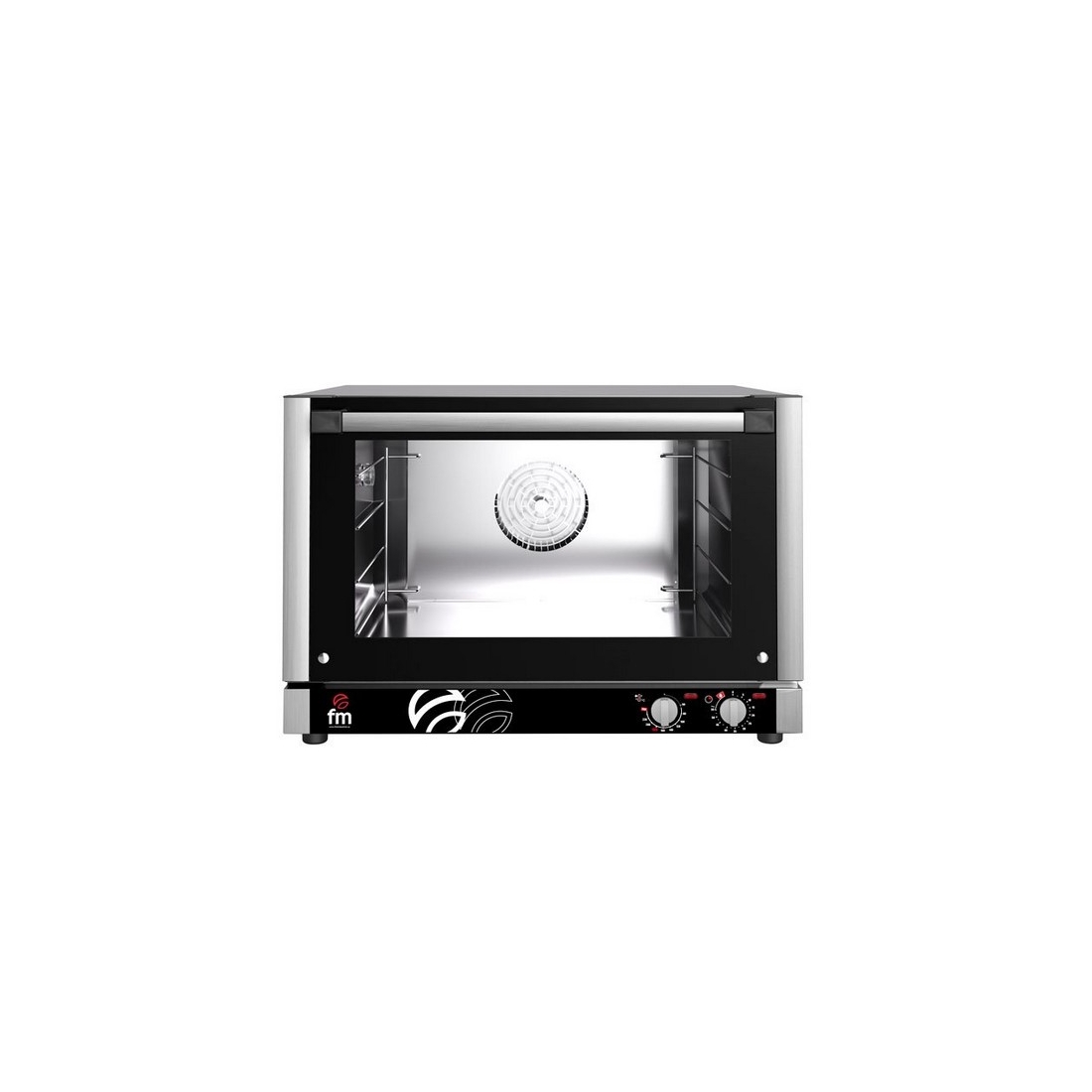 Horno de convección eléctrico, con 4 bandejas de 43x34 cm (incluidas) y una temperatura máxima de 250ºC. Potencia 3100W. Conexión monofásica. Ideal para espacios pequeños. Disponible con humidificador o con apertura frontal o apertura lateral.