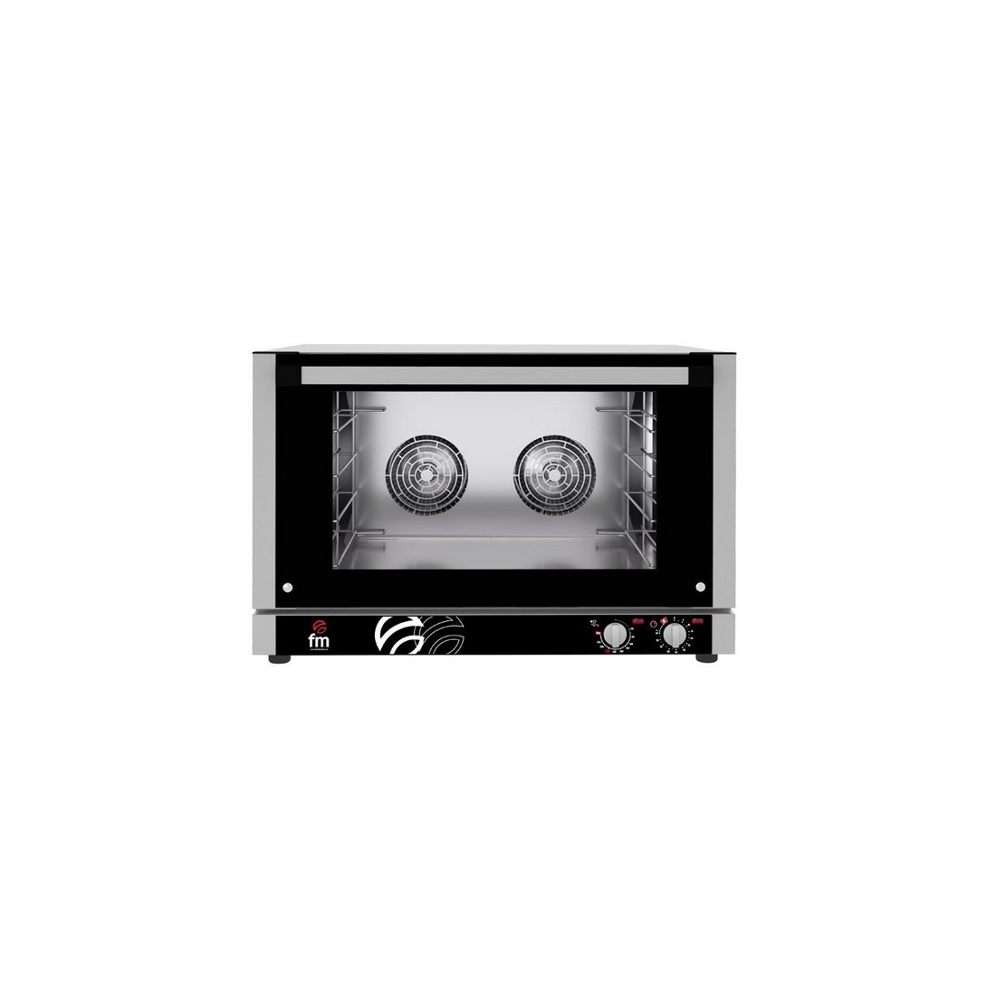 Horno de convección eléctrico para 4 parrillas de 60x40 cm o 4 GN 1/1. Cuenta con panel de mandos analógico. Equipado con 2 ventiladores. Incluye lampara en el interior, inversión de giro y alarma fin de ciclo. Potencia 6.300W. Conexión trifásica