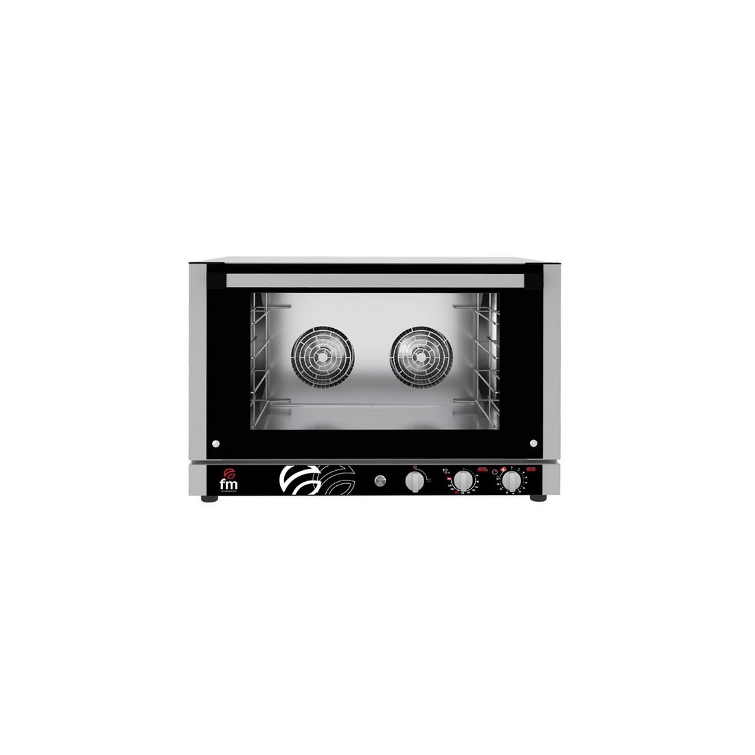 Horno de convección eléctrico, con 4 bandejas de 43x34 cm (incluidas) y una temperatura máxima de 250ºC. Potencia 3100W. Conexión monofásica. Ideal para espacios pequeños. Disponible con humidificador o con apertura frontal o apertura lateral.