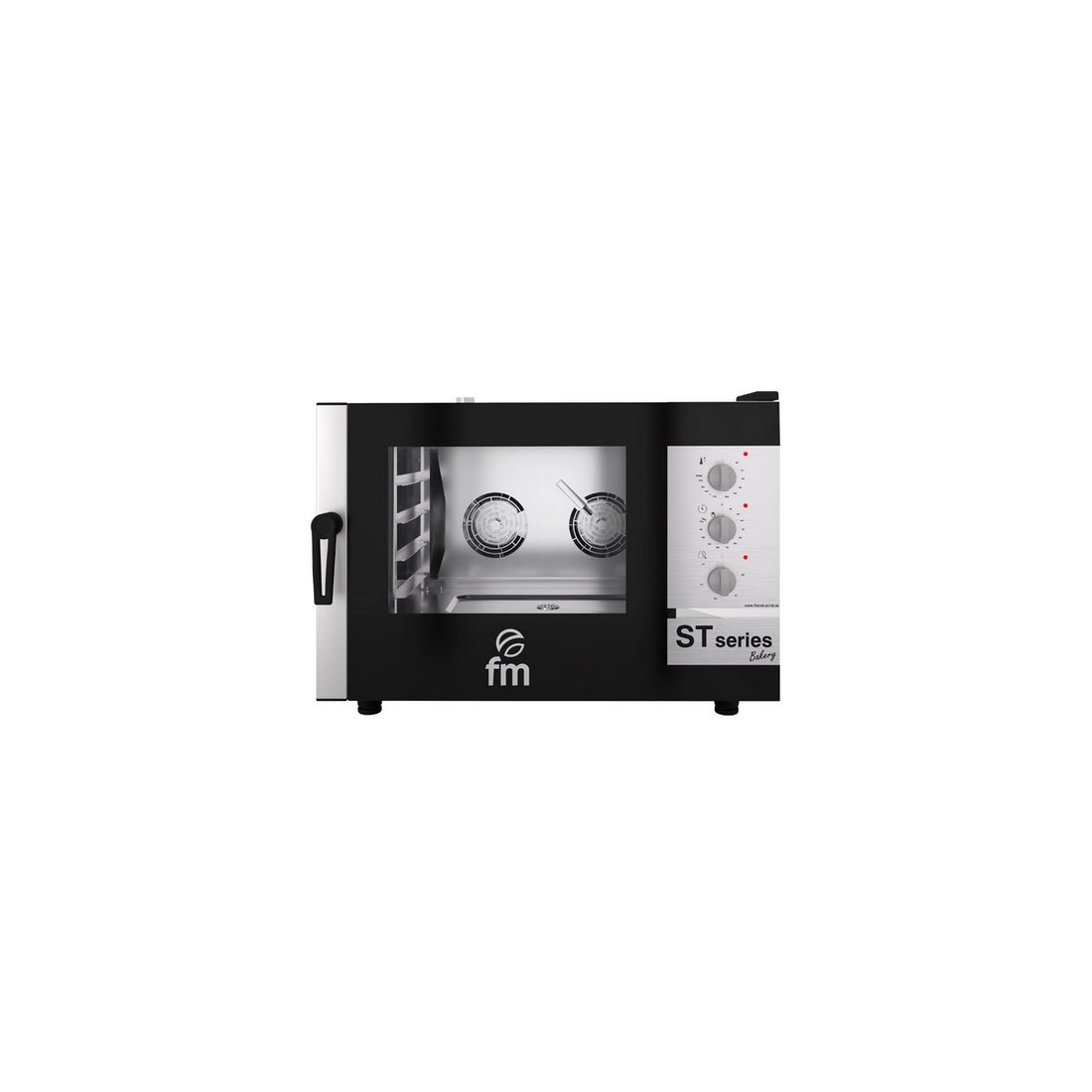Horno de panadería de la serie ST BAKERY. Equipado con panel de control manual y mucha facilidad de uso. Tiene una potencia de 7.500W y conexión trifásica. Cuenta con una capacidad de 4 bandejas 600x400 - 4 GN 1/1. Posición de bandeja transversal.