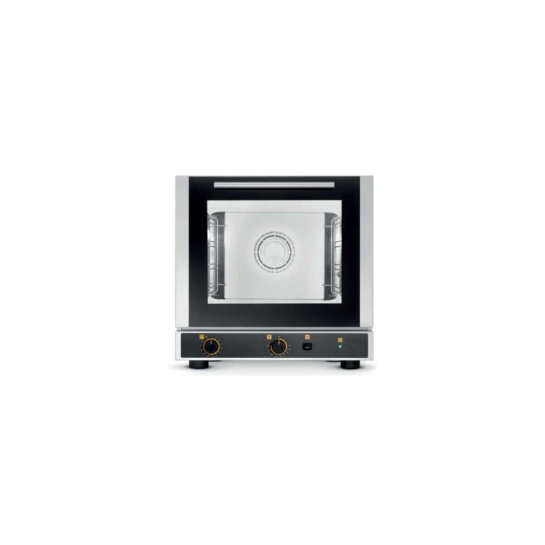 Horno de convección eléctrico, con panel de mandos electromecánico. Tiene capacidad para 4 bandejas de 43x34 cm. Está equipado con Humificador. La temperatura máxima que alcanza son 300ºC. Y unas medidas reducidas de 590 x 695 x 590 mm. Conexión monofásica.