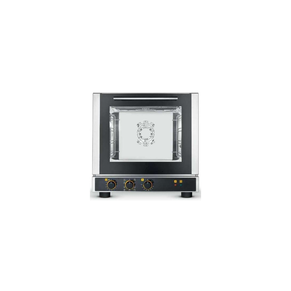 Horno de convección eléctrico, con panel de mandos electromecánico. Tiene capacidad para 4 bandejas de 43x34 cm. Está equipado con Grill, además, de cocción multifunción (8 funciones). La temperatura máxima que alcanza son 300ºC. Y unas medidas reducidas de 590 x 695 x 590 mm. Conexión monofásica