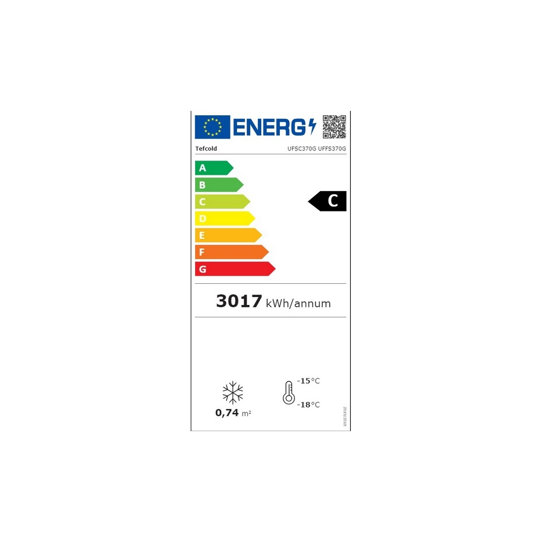 Armario Exposición Congelación UFFS370G de Tefcold, con una capacidad de 300 litros y una calificación energética clase C.