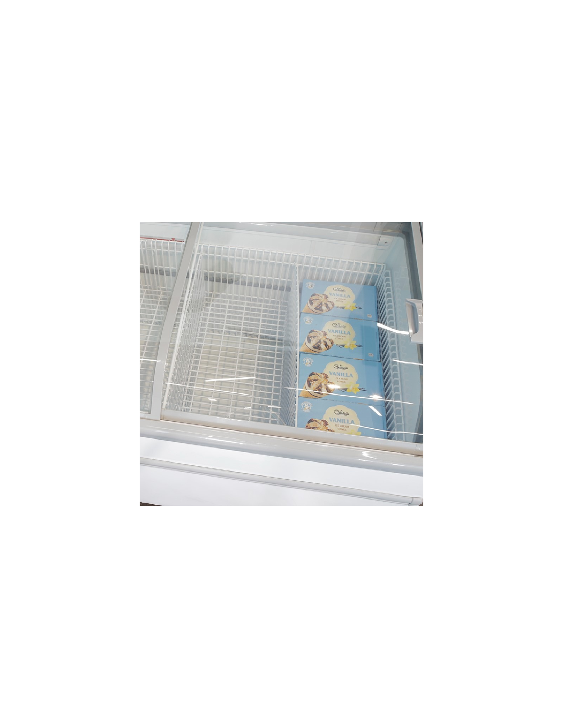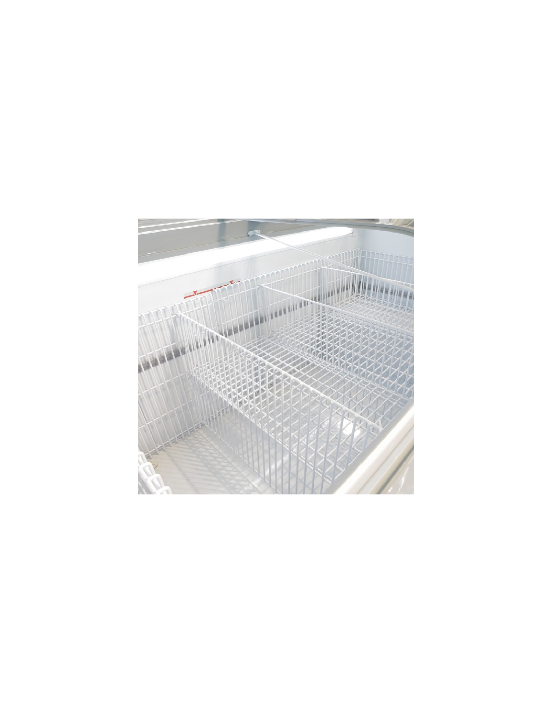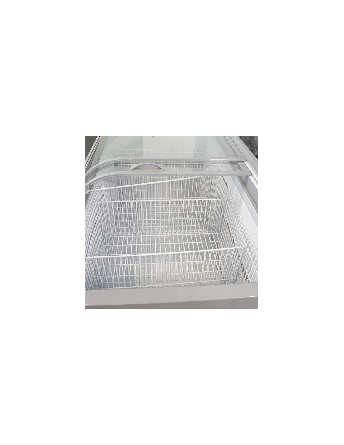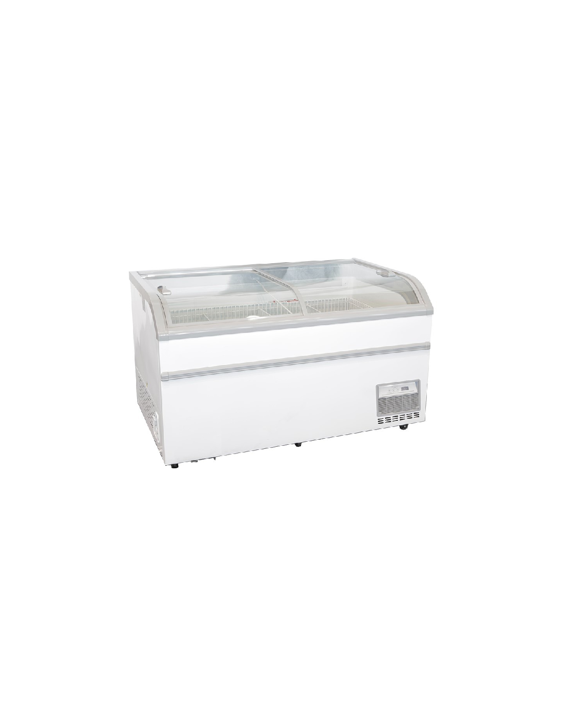 Isla de congelación horizontal de 459 L con rango de –22 °C a –18 °C y consumo de 7,23 kWh/24 h. Refrigeración estática, desescarche automático y control electrónico. Iluminación LED frontal y trasera, puertas e-glass y ruedas con freno. Medidas: 1470 × 875 × 835 mm. Tensión: 230 V.