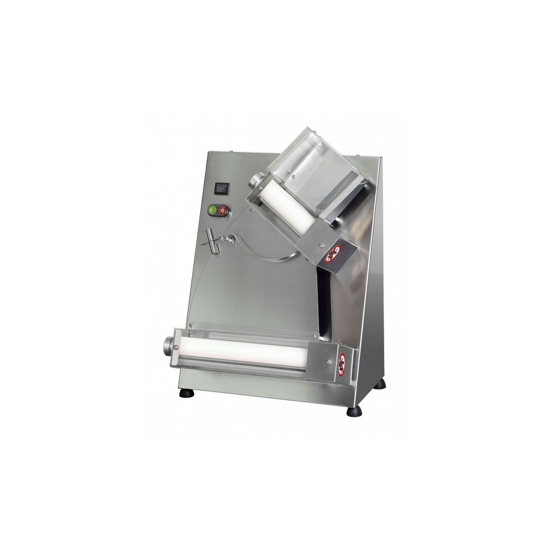 Formadora de masas de pizza para diámetros de 300 a 430mm, con dos rodillos de resina alimentaria. Está fabricada en acero inoxidable, su potencia es: 370W. Modelo de Fabricación Italiana. Rodillos alineados. Pedal incluido.