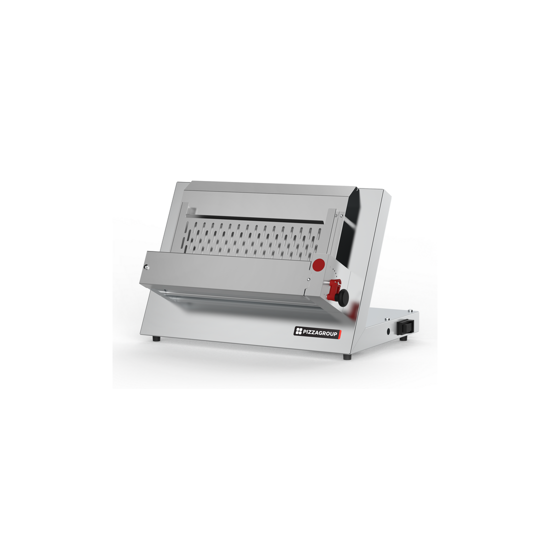 Laminadora de pizzas para diámetros de 260 a 400mm, con dos rodillos de resina alimentaria. Está fabricada en acero inoxidable, su potencia es: 500W. Modelo de Fabricación Italiana.