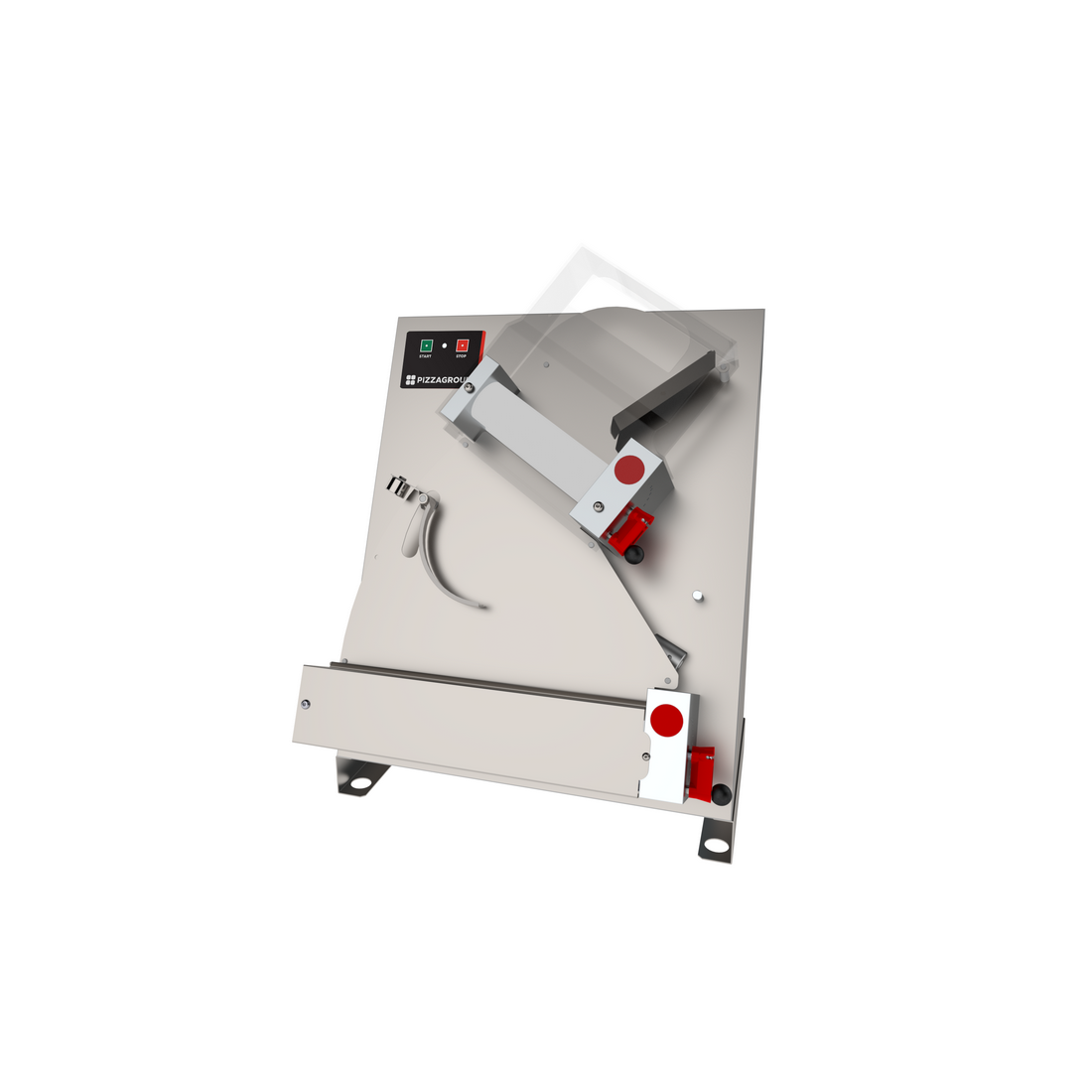 Formadora de masas de pizza para diámetros de 300 a 430mm, con dos rodillos de resina alimentaria. Está fabricada en acero inoxidable, su potencia es: 370W. Modelo de Fabricación Italiana. Rodillos alineados. Pedal incluido.