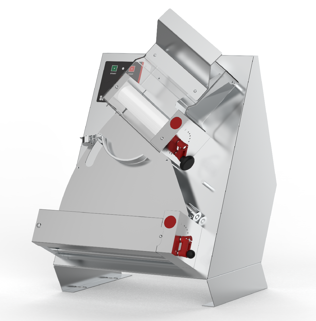 Formadora de pizzas para diámetros de 260 a 420mm, con dos rodillos de resina alimentaria. Esta fabricada en acero inoxidable, su potencia es: 370W. Cuenta con pedal de accionamiento.